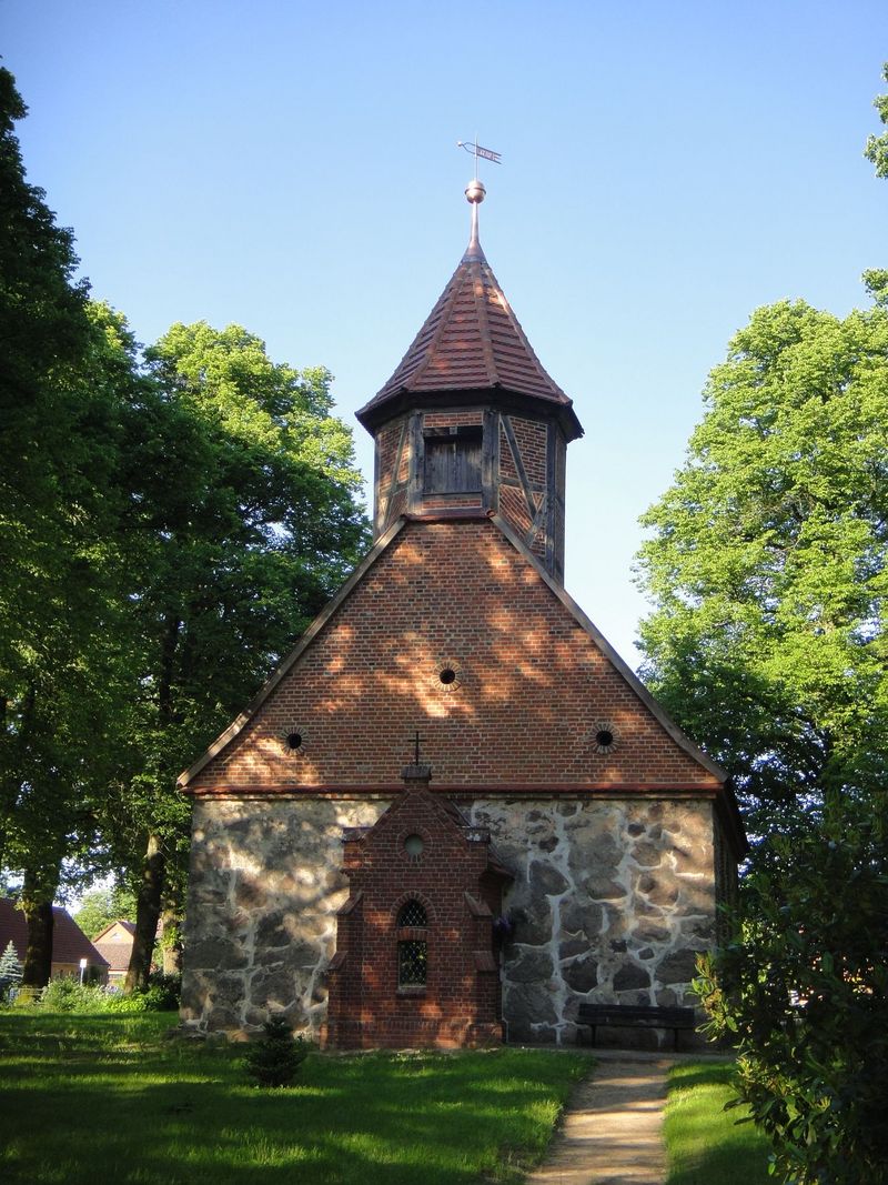 Die Feldsteinkirche wurde 1787 erbaut. Ende des 18. Jh. wurde am Westgiebel ein Vorbau angesetzt, sowie in die barocken Fensterleibungen neugotische Fenster eingesetzt. Der Kanzelaltar mit schlichten, barocken Stilelementen ragt bis unter die Decke. Den hinteren Teil des Kirchraumes prägt die Empore mit den kräftigen Eichenständern, die den aus dem Kirchendach ragenden Fachwerkturm tragen.