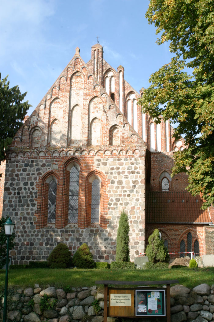 Die Dorfkirche in Reinberg ist eine mittelalterliche dreischiffige Backsteinhalle mit Feldsteinchor.