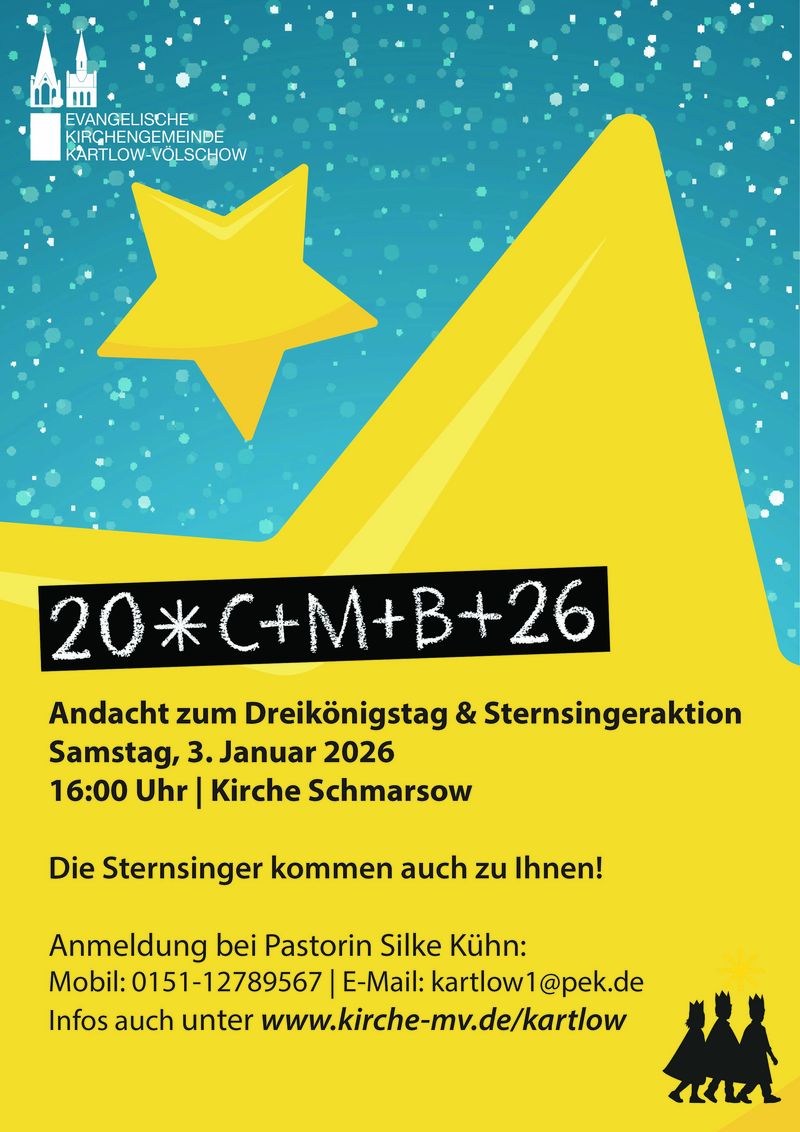 Wir wollen auch 2026 euer Zuhause wieder unter Gottes guten Segen stellen und kommen mit den Sternsingern gern zu euch! Am Samstag, den 3. Januar, starten wir um 16:00 Uhr mit einer Andacht in der Schmarsower Kirche. Nach einer warmen Stärkung geht es dann los zu euch! Wir haben in unserem Gemeindebus noch reichlich Platz für kleine und große Sternsinger, macht gern mit! Und wenn ihr euch anmeldet, kommen wir auch zu euch nach Hause mit Musik, Lachen und Segen! Anmeldung ganz einfach telefonisch, per WhatsApp oder per E-Mail bei Pastorin Kühn.