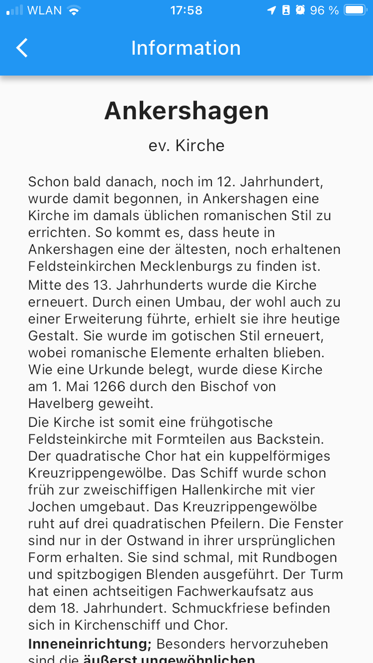 In Mecklenburg-Vorpommern gibt es eine Vielzahl an Kirchen und Kapellen. Mit dieser App können Sie sich mehr als tausend dieser meist großartigen Bauwerke vor dem Besuch anschauen. Die Kartendarstellung zeigt die Bauwerke in ihrer Umgebung. Mit Hilfe der integrierten Schnittstelle zu einer bei Ihnen installierten Navigationssoftware finden Sie auch leicht den Weg zu den Kirchen und Kapellen.