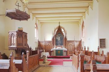 Vom alten Inventar sind nur die Altarleuchter, die Abendmahlsgeräte und der alte Taufstein geblieben. Der Taufstein wurde übrigens 1980 unter großen Steinen auf dem ehemaligen Parkplatz am Pfarrhaus entdeckt.