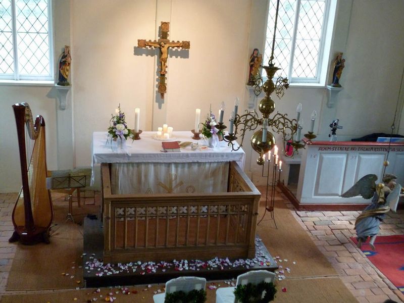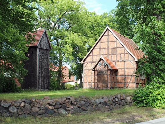 Der schlichte, rechteckige Fachwerkbau von 1703 hat einen etwas abseits stehenden, verbretterten Glockenturm. Der Innenraum mit neugotischen Elementen wurde mehrfach umgestaltet. Die Besonderheit aber ist der an der Decke hängende spätbarocke Taufengel, der zu Taufen herabgelassen wird.