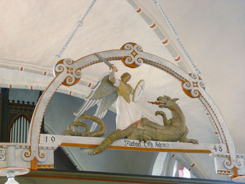 Von den beiden Leuchtern über dem Mittelgang zeigt einer mit der Jahreszahl 1948 den Kampf des Erzengels Michael gegen den Drachen. Gestiftet wurde dieser Leuchter von Pastor Behrendt. Als Motto wählte er aus dem 56. Psalm: „Ich habe dir, Gott, gelobt, dass ich dir danken will. Denn du hast mich vom Tode errettet, meine Füße vom Gleiten, dass ich wandeln kann vor Gott im Licht der Lebendigen.“ (Psalm 56.13,14) Worauf spielt der Drachenkampf an? Der zweite Leuchter mit den betenden und dankenden Engeln ist eine Stiftung des damaligen Besitzers der Bürstenfabrik.