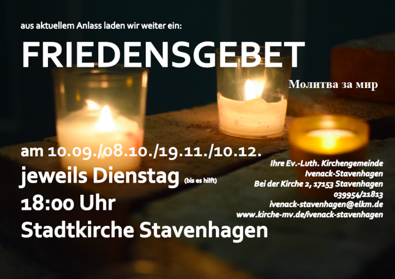 Wir beten, bewegen und setzen Zeichen. Wir bitten einmal im Monat dienstags um 18:00 Uhr in der Stadtkirche Stavenhagen um Frieden für unsere Welt.