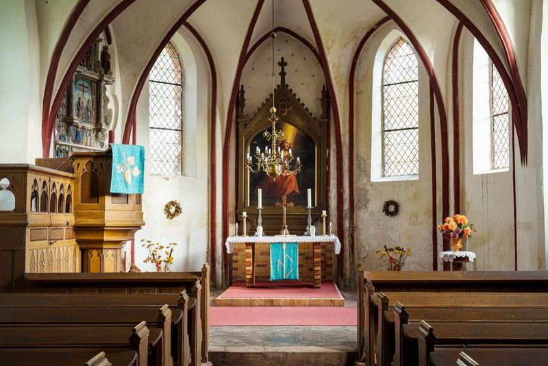 Die neugotische Innenausstattung nur teilweise erhalten. Das Altarbild, das eine Kopie des Kartlower Bildes ist, zeigt ebenfalls den betenden Christus im Garten Gethsemane. Im nördlichen Chorraum befindet sich ein farbig gefasstes Sandsteinepitaph in schönen Renaissanceformen für den Erblandmarschall E. F. v. Maltzahn (1571–1622), gestiftet 1625 von dessen Ehefrau Maria. Es enthält, über einer Stiftungsinschrift, die Darstellung der Familie: Vor dem knienden Verstorbenen – ebenfalls kniend – seine Gemahlin und seine drei Töchter. Dieser folgt nach oben hin ein Kreuzigungsrelief mit Maria und Johannes, dessen Besonderheit darin besteht, dass der Gekreuzigte nicht mehr am Kreuz hängt, sondern bereits auferstanden ist. Die mittlere Bekrönung des Epitaphs bildet Christus als Retter der Welt, seitlich sind die Apostel Paulus (links) und Petrus (rechts) angeordnet. Zahlreiche farbige Wappendarstellungen sowie allegorische Darstellungen des Todes und des Schlafes weisen auf die Vergänglichkeit des menschlichen Lebens.
