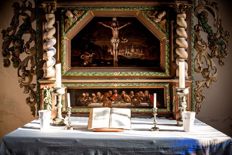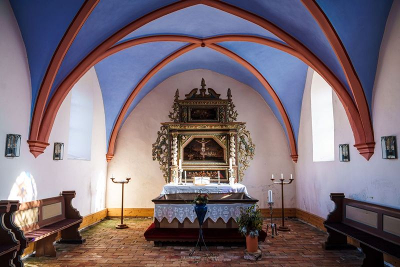 Im Innenraum sehenswerter barocker Altaraufsatz mit gewundenen Säulen sowie reicher Akanthus- und Fruchtwerkschnitzerei, um 1700, mit drei übereinander angeordneten Gemälden zur Passion Christi. Unten: Das letzte Abendmahl. In der Mitte: Die Kreuzigung Christi vor dem Hintergrund der Heiligen Stadt Jerusalem. Oben: Darbringung des Leidenskelchs im Garten Gethsemane. Die Restaurierung des Chorraums erfolgte 2006.