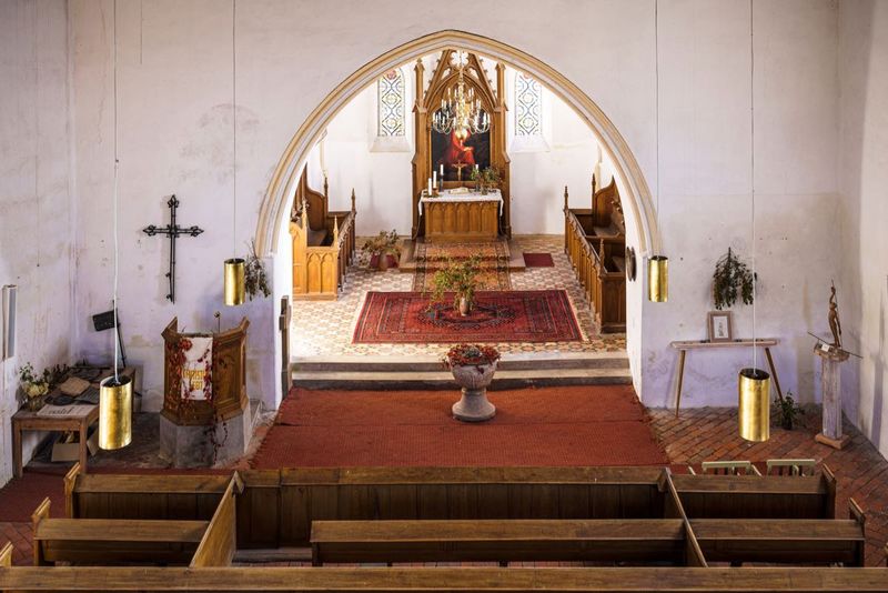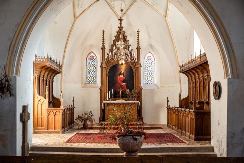 Innenraum: Im Chor Sterngewölbe mit Birnstabrippen, im Schiff Holzdecke über freiliegendem Hängewerk. Nicht mehr ganz vollständige neugotische Holzausstattung, wohl auch 1869, von ergreifender Schlichtheit.