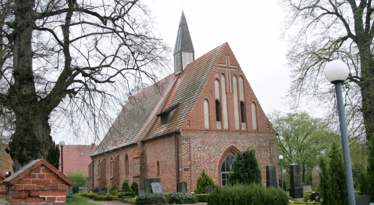 Die Kirche wurde wohl schon vor 1280 unter dem Patronat des Klosters Eldena errichtet. Wenig später, etwa um 1300, kamen Chor und Sakristei hinzu. Das Turmuntergeschoß und Schiff folgten 100 Jahre später. Die Klassizistische Buchholzorgel stammt aus dem Jahre 1868. Ende der sechziger Jahre des 20. Jh. wurden Reste mittelalterlicher Wandmalerei freigelegt, die Szenen des Kreuzweges Christi zeigen. Ältestes liturgisches Stück ist die Fünte (etwa 1250), die heute als Taufbecken gottesdienstlich genutzt wird.