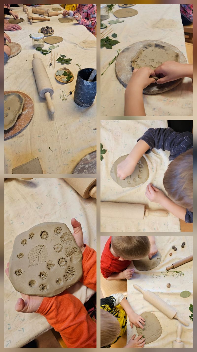 Mit viel Freude wurde geknetet, gerollt und geformt. Entstanden sind wunderschöne Schalen, die die Kinder anschließend mit Naturmaterialien wie Blättern und Gräsern verzierten. Außerdem durfte jedes Kind noch einen eigenen Anhänger gestalten – ein ganz persönliches Andenken an diesen kreativen Vormittag.