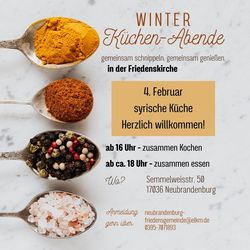 Ab 16 Uhr ist die Küche geöffnet. Sie sind herzlich dazu eingeladen, das Kochen zu unterstützen oder neugierig zu sein, was entsteht. Ab 18 Uhr wird gemeinsam gespeist. Herzliche Einladung dazu!