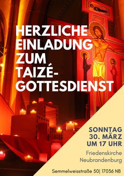 VeranstaltungTaizé Gottesdienst 30.03.2025 · 17:00 Uhr · 18:00 Uhr FriedenskircheSemmelweisstraße 5017036 Neubrandenburg Im Kalender speichern (.ics) Route berechnen zurück zur Übersicht der Veranstaltungen StartseiteEditorialGottesdiensteAndere GottesdiensteGemeinsame VeranstaltungenKirchenmusikMusik an St. JohannisKinder und JugendServiceLINKSGemeindebriefeUmfrageAnmelden