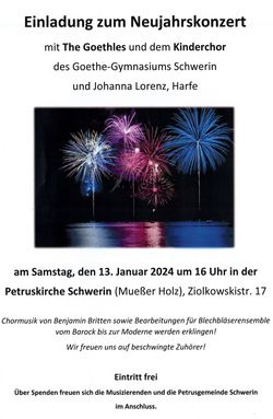 VeranstaltungNeujahrskonzert mit dem Kinderchor des Goethe Gymnasiums 13.01.2024 · 16:00 Uhr · 17:00 Uhr Gemeindezentrum PetrusgemeindeZiolkowskistraße 1719063 Schwerin Im Kalender speichern (.ics) Route berechnen zurück zur Übersicht der Veranstaltungen StartseiteGottesdienste und VeranstaltungenMusikChöre/EnsemblesGemeindelebenKinder und FamilienKonfirmanden und JugendErwachseneEhrenamtTaufe Trauung Eintritt BeerdigungOffene KircheSeelsorge und BeratungKirchengemeindenKontakt und MitarbeitendeAnmelden