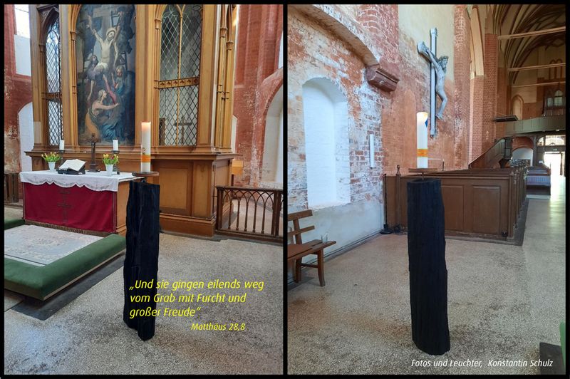 Mich stimmt es zuversichtlich, dass ein junger Gemeindepädagoge und Tischler für das Pilgerkloster in Tempzin und die dazugehörige Kirche einen Leuchter für die Osterkerze gestaltet und dem Kloster übereignet hat. In den Leuchter aus Mooreiche (Doberaner Land) ist das Antoniterkreuz eingearbeitet (hier nicht sichtbar). Die Osterkerze leuchtet auf dunklem, fast schwarzem Untergrund, - wie symbolträchtig. In und mit Christus stehen auch wir auf aus der Leere, dem Dunkel des Todes.
