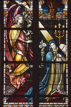 Das Kleid Marias ist weiß wie die neben ihr stehende Madonnenlilie als Symbol der Unschuld. Ihr blauer Mantel verweist auf die Himmelskönigin. Nicht nur Farben und Attribute, auch die Fältelung der Gewänder folgt spätmittelalterlichen Vorbildern. Das Gewand Gabriels macht das Heranrauschen des Engels sinnfällig. In der Linken hält er ein Zepter, um das sich das Band mit seiner Botschaft „Ave Maria gratia plena...“ schlingt. Ein Leuchter mit drei Kerzen verweist auf die heilige Dreifaltigkeit. Eine Stiftungsinschrift fehlt auf dem Verkündigungsfenster. Das Weihnachtsbild darüber zeigt Maria und Joseph vor dem Kind und drei musizierende Engel. Einer hat eine Laute, einer eine Harfe und einer eine Geige. Joseph hält als Attribut des Zimmermanns ein Winkelmaß in der Hand. Ochs und Esel sind von den Fensterpfosten und Stegen weitgehend verdeckt.