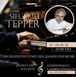 VeranstaltungKlavierkonzert mit Siegfried Tepper 10.04.2026 · 19:00 Uhr · 20:00 Uhr Begegnungshaus LambrechtshagenBauernreihe 318069 Lambrechtshagen Im Kalender speichern (.ics) Route berechnen zurück zur Übersicht der Veranstaltungen StartseiteGrußwortGottesdienste und VeranstaltungenGruppen und KreiseDorfengelGemeindebriefeKircheOrgelSakramentsschrankFriedhofFriedhofsordnungFriedhofsgebührenordnungDownloadsPartnergemeindeRückblickeHistorieKirchenhistoriePfarrerBaugeschichteKontakt und MitarbeitendeAnmelden