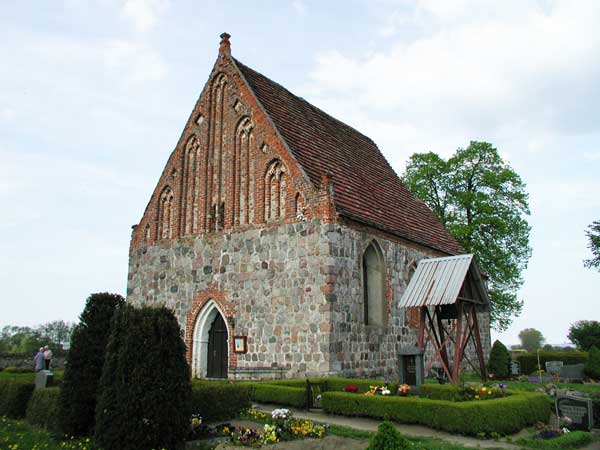 Der Westgiebel wird oberhalb des bis zur Traufe reichenden Feldsteinmauerwerks als Backsteinblendgiebel mit Spitzbögen und Raufen weitergeführt. Eine Balkendecke von 1700 überspannt Kirchenschiff und Chor stützenfrei, Deckenbalken und Bohlenabdeckung mit barocker, ornamentaler Bemalung.