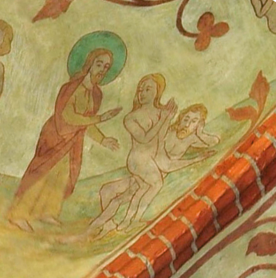 Wir beginnen in der Kappe 3 „Versuchung und Vertreibung aus dem Garten Eden“, in dem die ersten beiden Apostel eine besondere Stellung haben. Sie sind am Anfang der Apostelreihe zu sehen, wie häufig in der mittelalterlichen Kunst. Der Apostel Petrus ist mit dem Schlüssel und Paulus mit dem Schwert dargestellt. Paulus gehört nicht zur Zahl der ursprünglichen Apostel, die von Jesus selbst berufen worden sind.