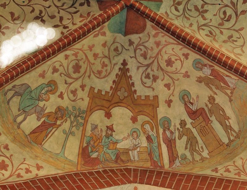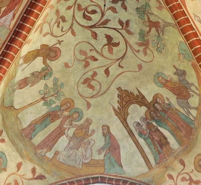 Gewölbemalereien erzählen Geschichten aus der Bibel und stellen wichtige Personen dar. Das theologische Programm dieser Gewölbemalerei ist die Verkündigung des Glaubens von der Erschaffung der Welt, der Geburt Christi und der Erlösung durch ihn bis hin zur Verkündigung der Frohen Botschaft durch die Apostel.