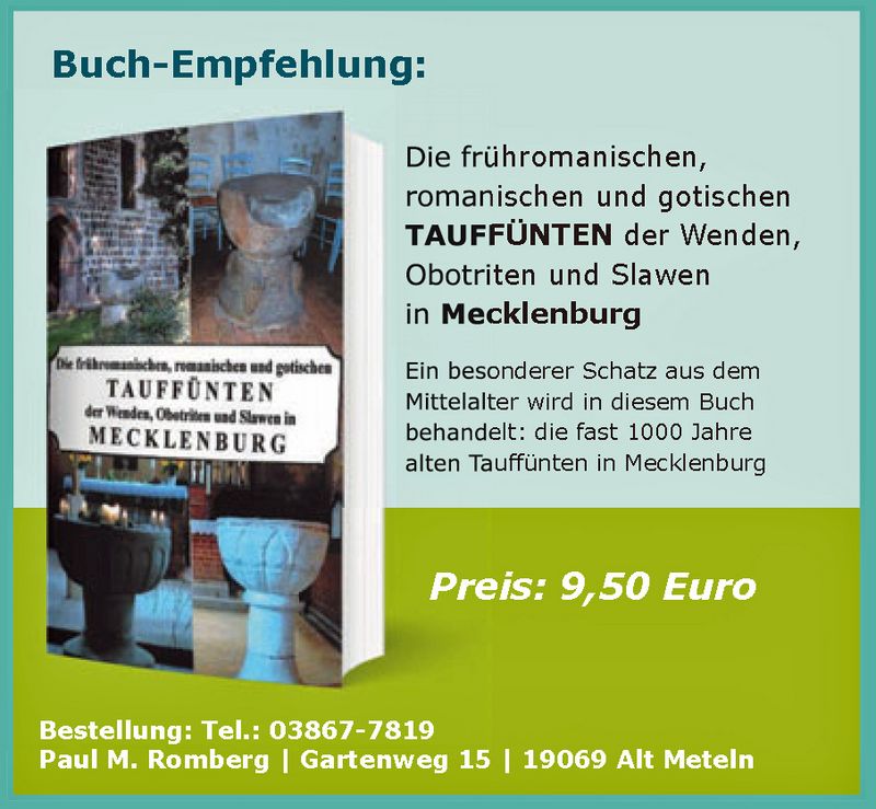 Text aus dem Buch "Die frühromanischen, romanischen und gotischen Tauffünten der Wenden, Obotriten und Slawen in Mecklenburg", 2. überarbeitete und stark erweiterte Auflage 2019, Paul Martin Romberg, der uns dankenswerterweise die Genehmigung zur Veröffentlichung gab: