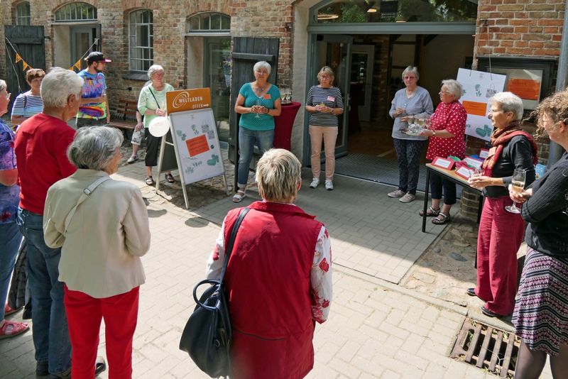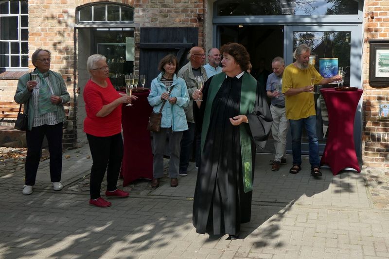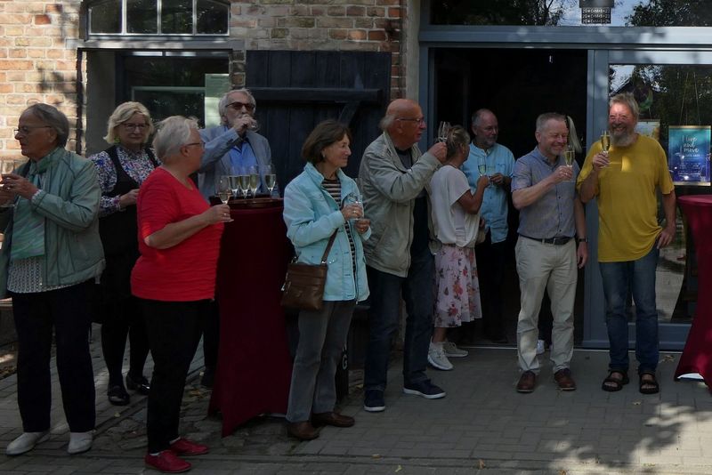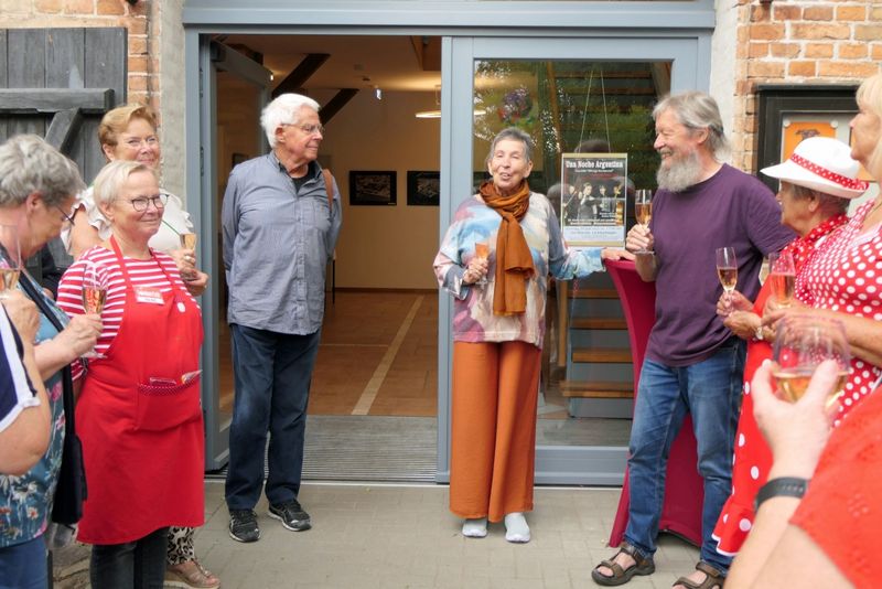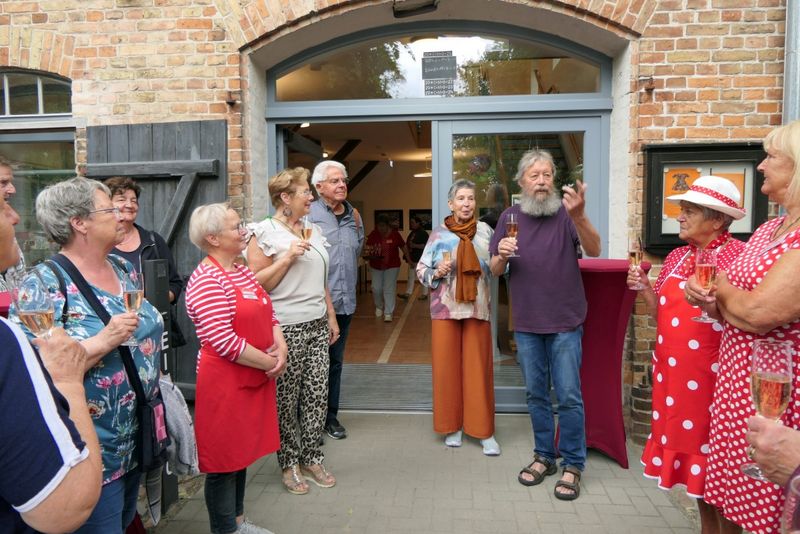 Während des SommerCafés wurde die Ausstellung "Norddeutsche Landschaft und Menschen" von Dr. Heidrun Kohlmann, einer Freizeitmalerin aus Warnemünde, eröffnet. Gearbeitet hat sie bis zum Ruhestand als Fachärztin für Neurologie und Psychiatrie. Mit gut 50 Bildern ist es eine große Ausstellung mit sehenswerten Motiven. Auf die Frage, welche der jeweilige Favorit sei, kam von Besucher*innen keine Antwort - so schwer ist die Auswahl. Alle Bilder können gekauft werden, eine Preisliste liegt aus, ebenso die Kontaktdaten der Künstlerin. Die Ausstellung ist bis Sonntag, 7.9.2025, in der Scheune zu sehen.