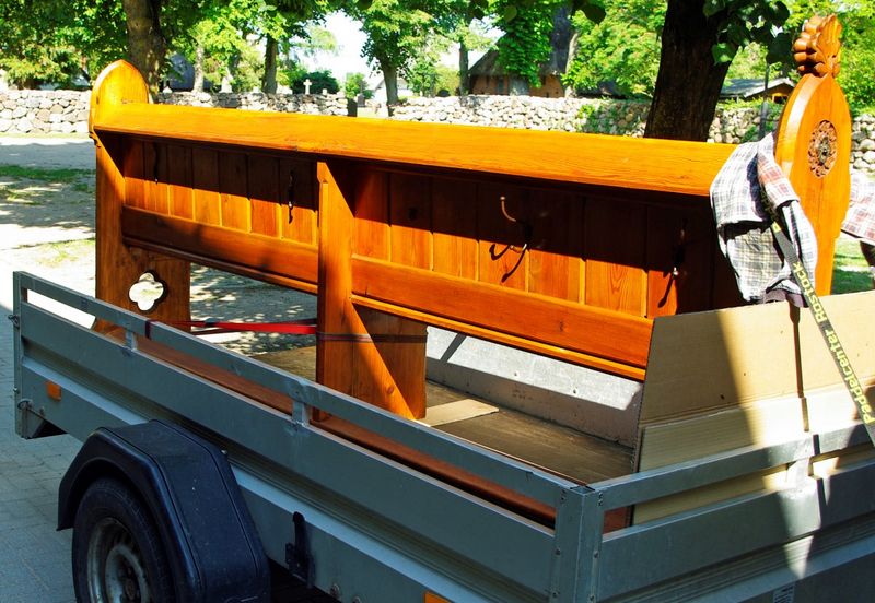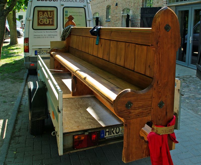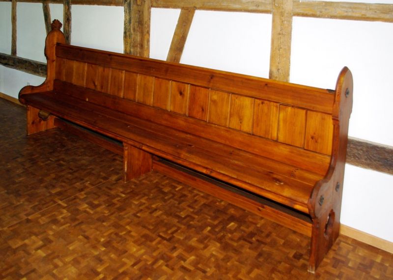 Beim Ausräumen der Scheune war auch eine relativ gut erhaltene Kirchenbank dabei, die zuerst eingelagert, jetzt restauriert ihren Platz im Saal der Scheune hat.