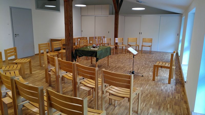 Am Sonnabend, 16. Mai 2020, konnten wir mit einigen Helferinnen und Helfern die Scheune einräumen. Wir sind vom alten Gemeinderaum in die neuen Räume umgezogen. Die Holzstühle werden natürlich weiter benutzt, ein paar Tische und Stühle wurden uns geschenkt. Aber auch neue Möbel - wie die Tische im Saal - wurden ausgepackt und mit dem überaus komfortablen Transportwagen vom Lager in den Saal gefahren. Der große Wandschrank ist ein guter Aufbewahrungsort, wenn die Tische nicht gebraucht werden. Die Transportwagen vermeiden das Tragen der relativ schweren Tische. Die Gruppenräume im Obergeschoß sehen noch unaufgeräumt aus, die Stühle bekommen neue Gleiter und die Schränke werden später eingeräumt. Unter Beachtung der Abstandsregeln brauchen die Arbeiten etwas länger, Zeit haben wir aber.