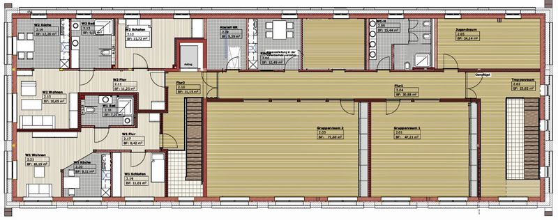 - drei unterschiedlich große Gruppenräume 25 – 70 m²