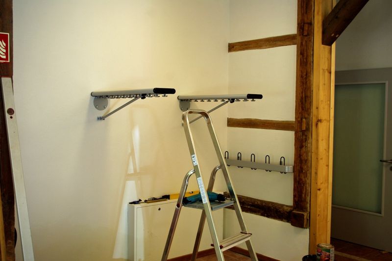 Die "normalen" Türen wurden alle eingebaut, es fehlen noch die Feuerschutz- und Wohnungstüren. "Kunst am Bau" - ein schön altes Vorhängeschloß wurde gespendet und schließt nun die Blindtür an der Straßenseite zu. Die großen Scheiben der Außentüren blinken und blitzen nach großen Putzeinsatz. Herzlichen Dank. Die Laufschienen für die Schiebetüren am Wandschrank im Saal wurden eingepasst. Nach wochenlangem Warten ging endlich die neue Photovoltaikanlage in Betrieb, wir haben ab jetzt viel eigenen Strom. Links im letzten Bild stehen die Stromspeicher.