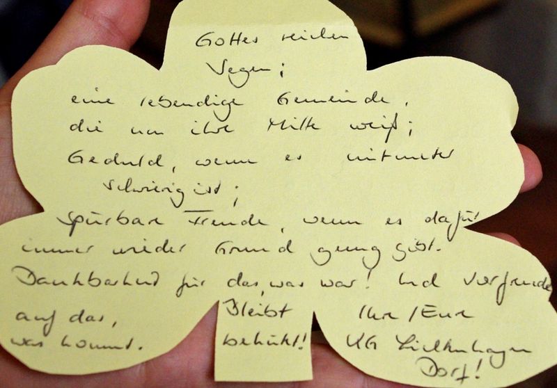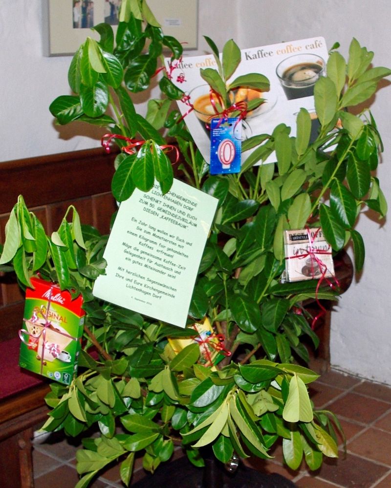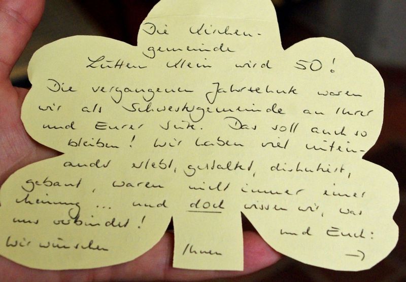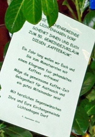 Am Sonntag, 4. September 2016, feierte die Kirchengemeinde zusammen mit der Lichtenhäger Gemeinde ihr 50jähriges Bestehen in einem Festgottesdienst. Die Grüße aus Lichtenhagen waren ein "Kaffeebaum" und ein großes Blatt mit Segenswünschen.