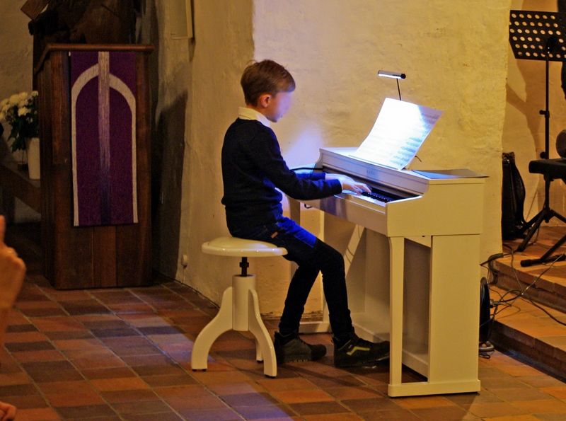 In diesem Jahr waren zum ersten Mal Tischharfen und ein Schlagzeug zu hören - natürlich nacheinander. Mit Trompete, Gitarre und Klavier wurden Stücke vorgetragen, und viele Stimmen erklangen. Ein sehr schöner Mix quer durch die Musikkunst unserer Gemeinde. Die vielen Gäste in der vollbesetzten Kirche sparten nicht mit großem Applaus.