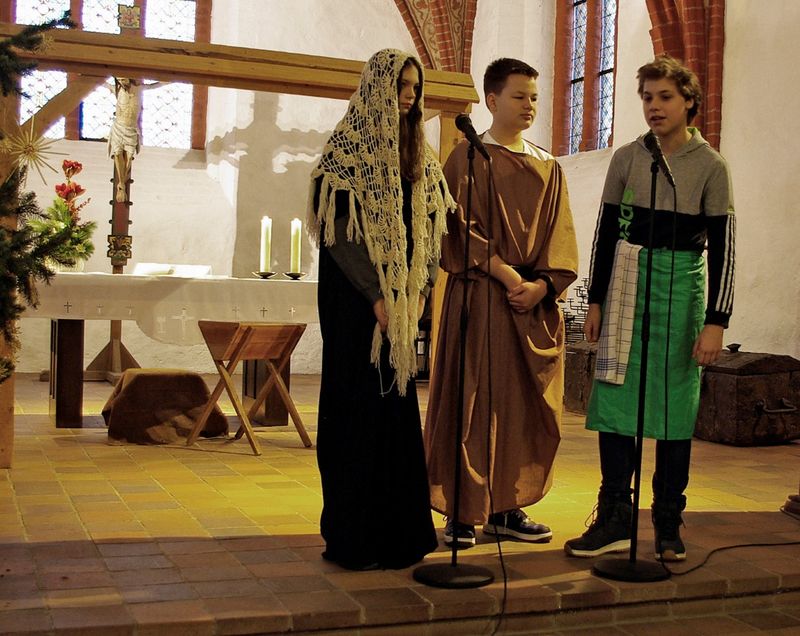 Christenlehrekinder spielten die Weihnachtsgeschichte - mit Maria und Joseph, die keine Herberge fanden und schließlich im Stall unterkamen, zwei Wirte hatten sie weiter geschickt. Die Hirten hörten die frohe Botschaft vom Verkündigungsengel und besuchten das Jesuskind im Stall. Die drei Weisen aus dem Morgenland fanden das Kind in der Krippe liegen und beteten es an.