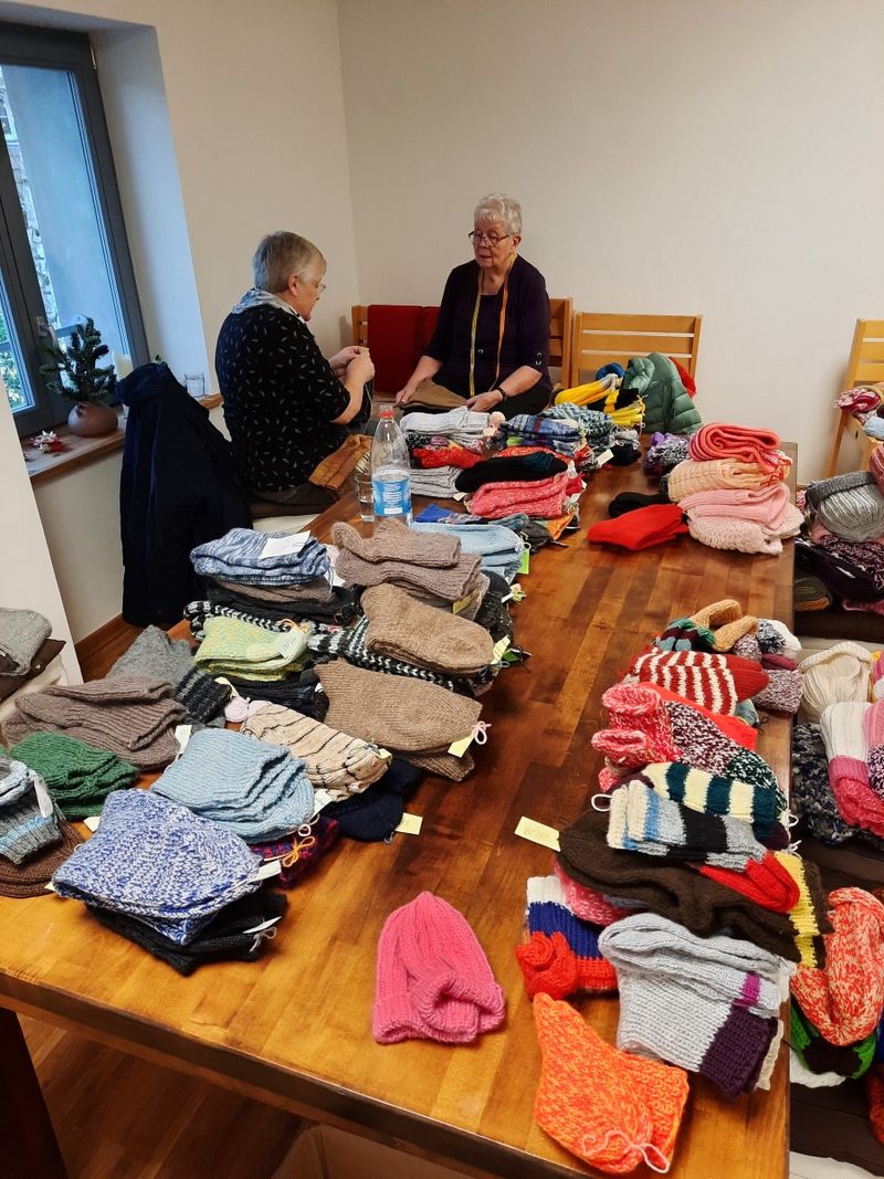 Große Pakete mit selbstgestrickten Mützen, Schals und Socken von unseren fleißigen Frauen von den „Stumpfen Nadeln“ gingen an diese drei unterschiedlichen Einrichtungen (drei Bilder).
