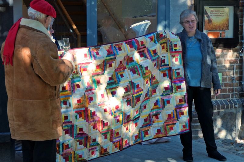In der Kirche und mit Tonübertragung in den Saal der Scheune feierten wir einen schönen Adventsgottesdienst. In der Kirche und Scheune wurde nicht gesungen, dafür aber draußen vor der Scheune zum Abschluß mit Orgelbegleitung. Im Gottesdienst wurde Deborah Blum für die wunderschöne Quilt-Ausstellung ein Buch mit Fotos aller Ausstellungsobjekte übergeben und ihr noch einmal mit herzlichem Beifall gedankt.. Nach dem Gottesdienst fand eine "amerikanische Versteigerung" einer gebackenen Krippe statt. Der Erlös von 83 Euro wird zur Finanzierung des neuen Sternenquilts für das Foyer verwendet.