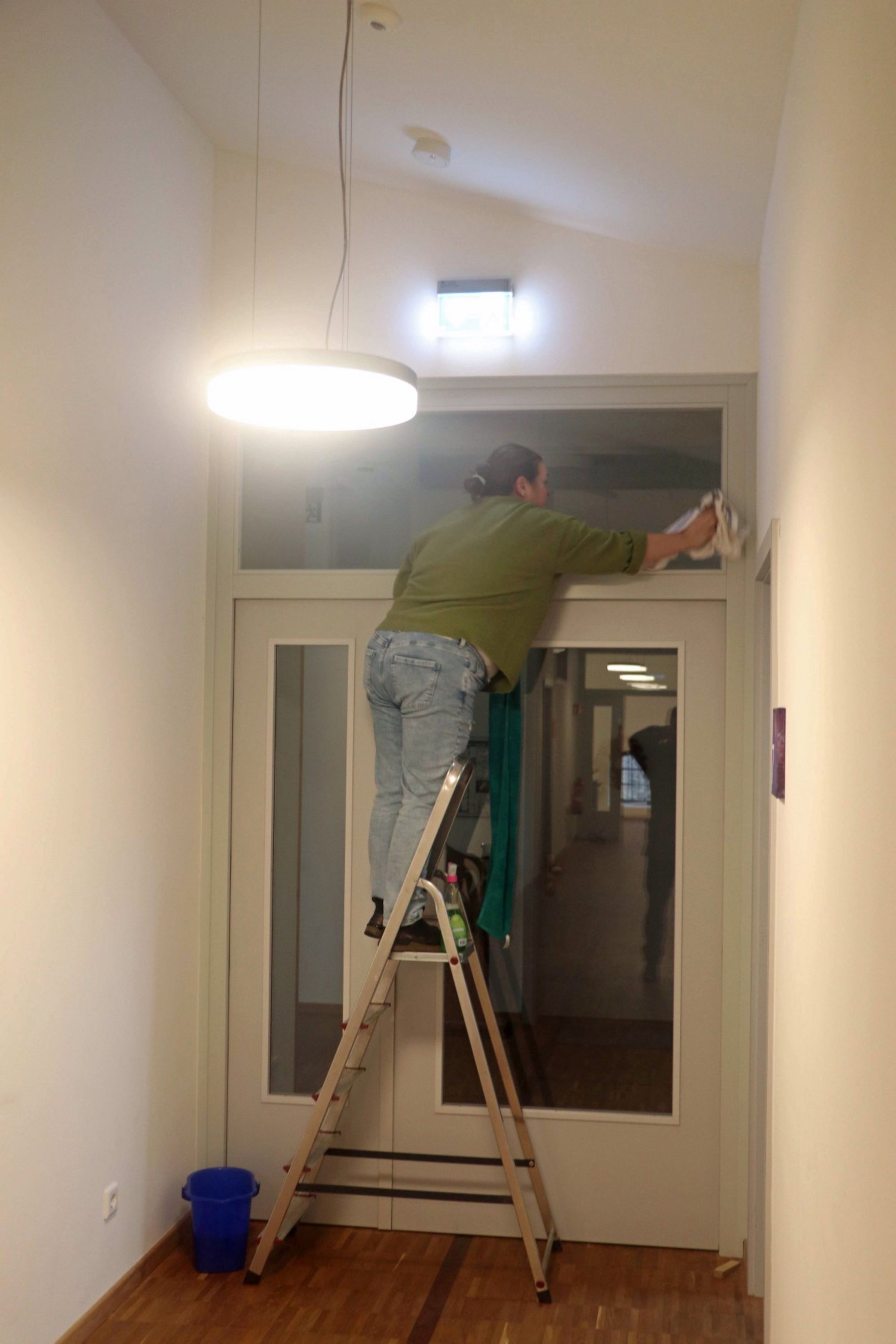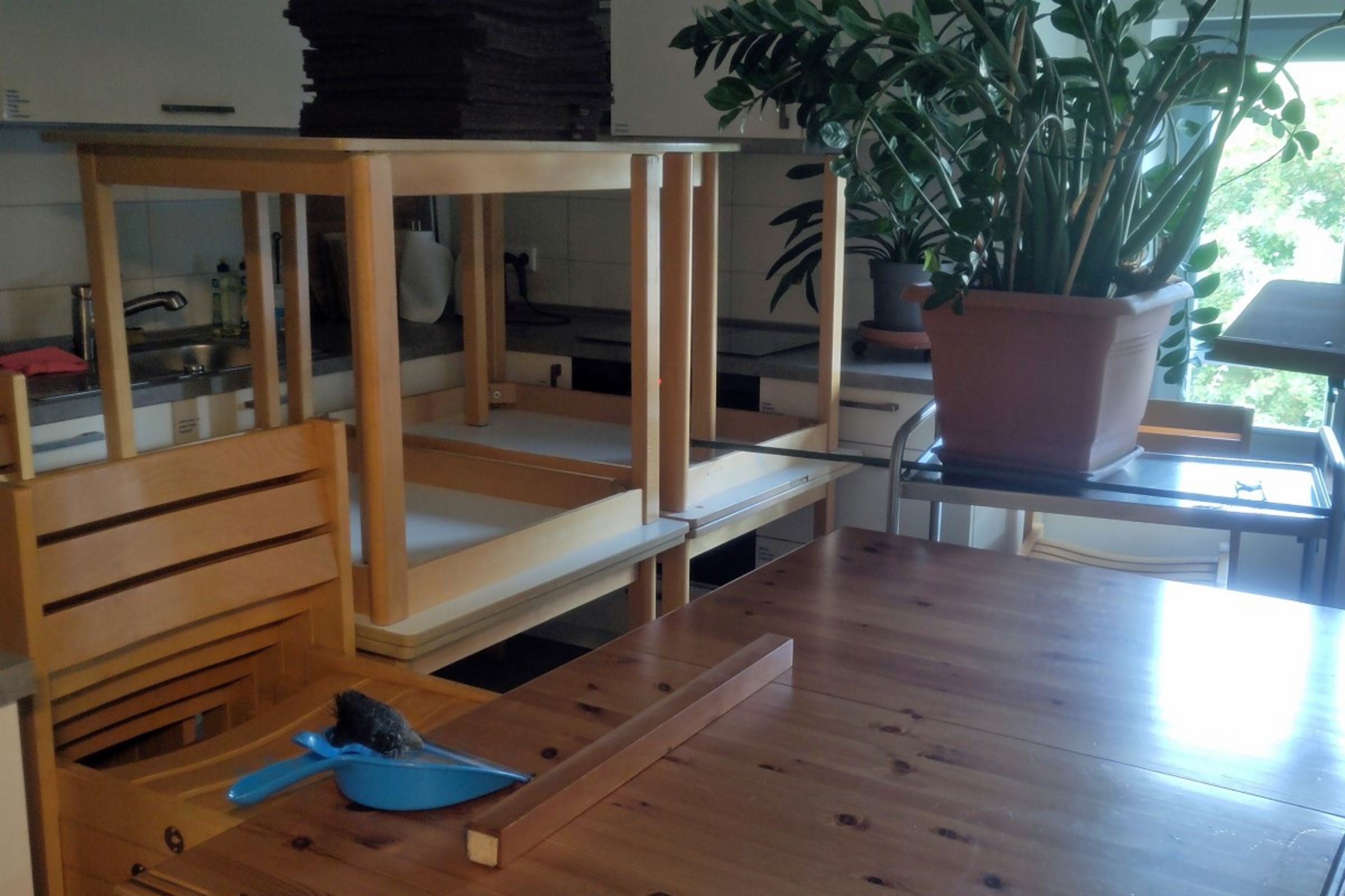 Nach fünf Jahren Betrieb in der Scheune wurde es Zeit für eine große Fußbodenpflege mit Abschleifen und Ölen des Parketts. Die Arbeit übernahm in bewährter Weise Firma Bembé aus Warnemünde, die auch das Parkett verlegt hatten. Alle Räume mit Holzfußboden mußten frei geräumt werden, die Möbel passten gut in die Küche und Toilette im OG und unten ins Foyer, wo sogar der Flügel einen guten Platz fand. Herzlichen Dank für die Hilfe der Männergruppe beim Aus- und Einräumen. Beim letzten Bild ist der fertige Fußboden im Saal zu sehen.