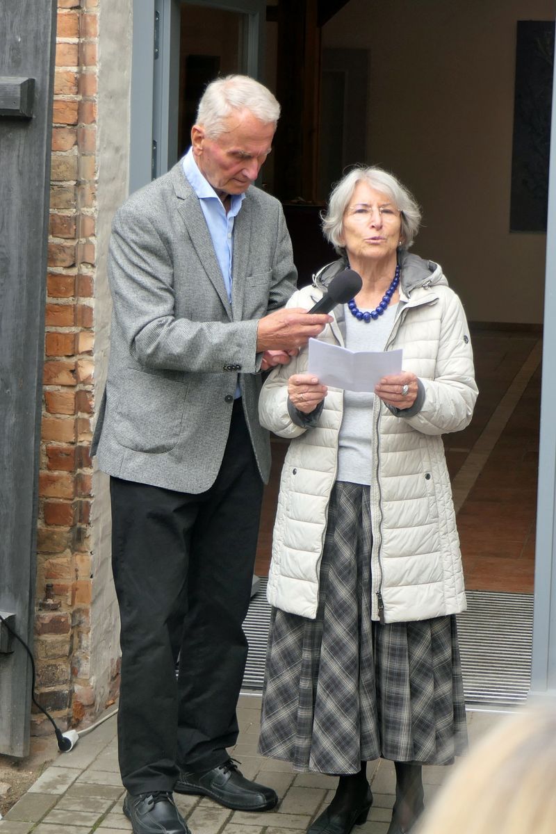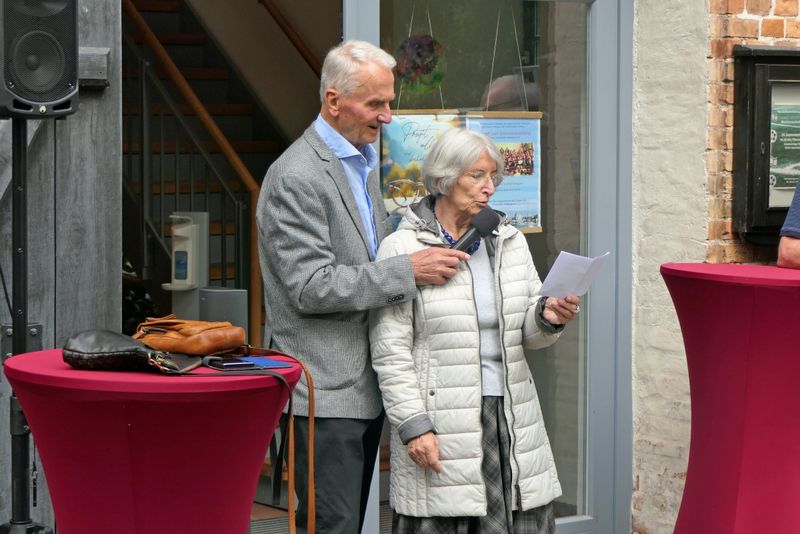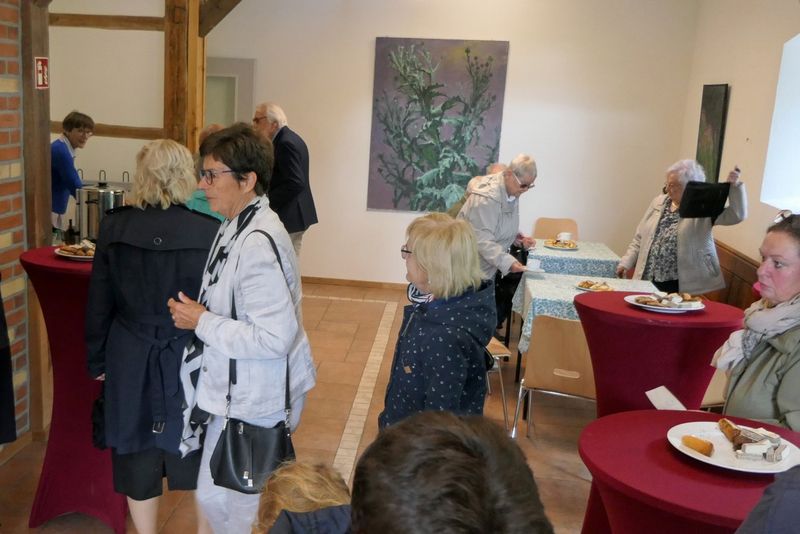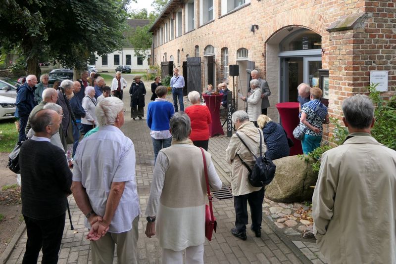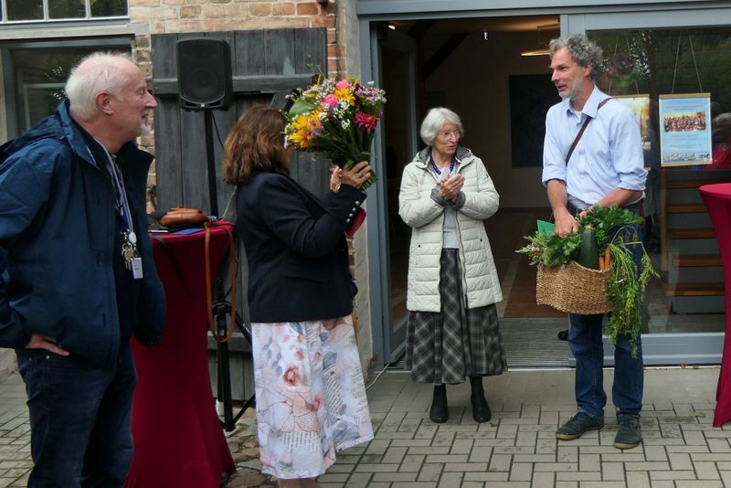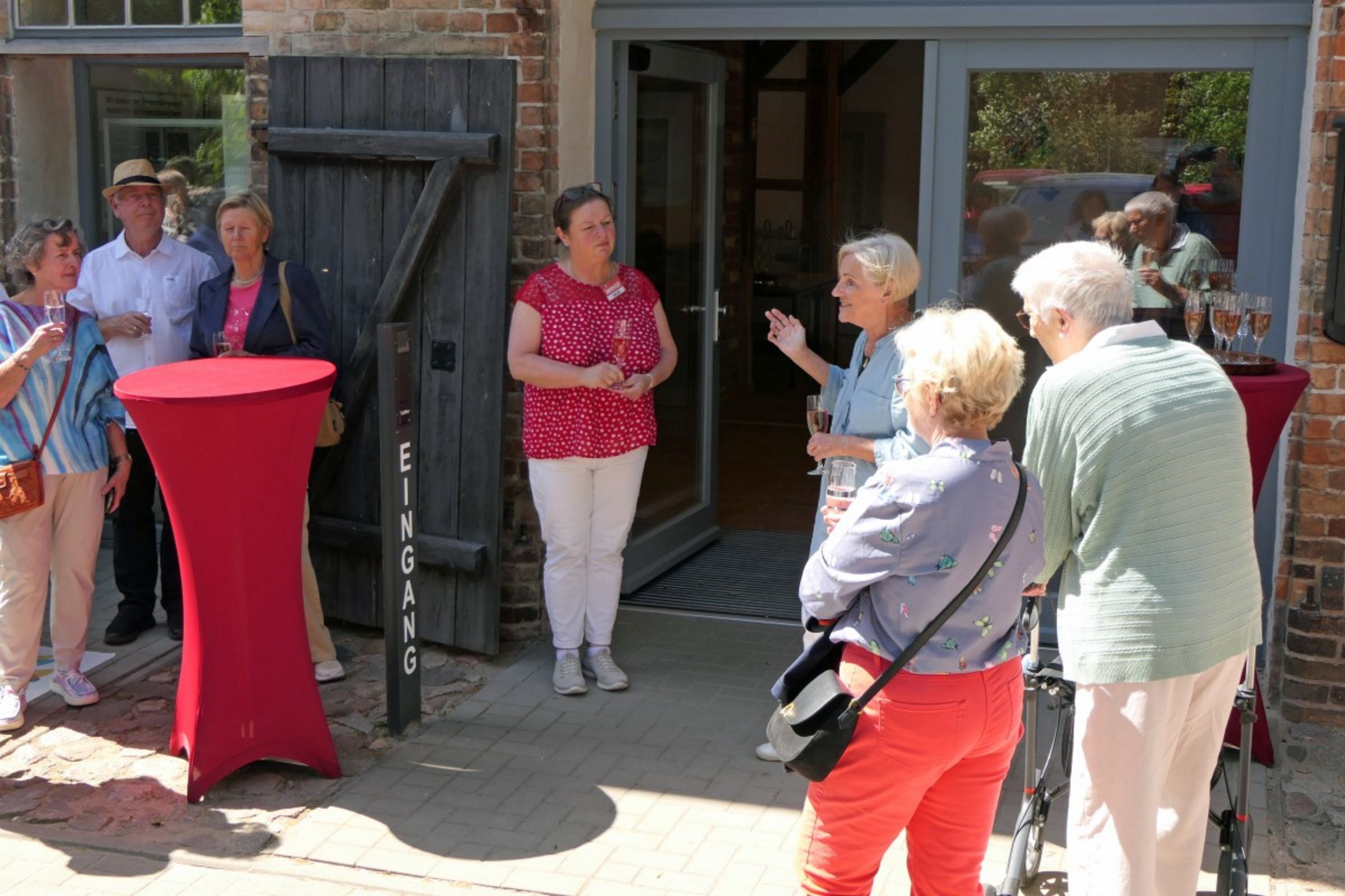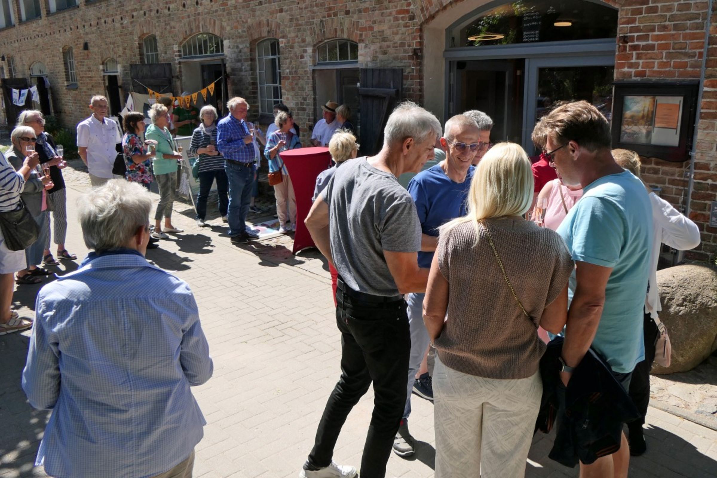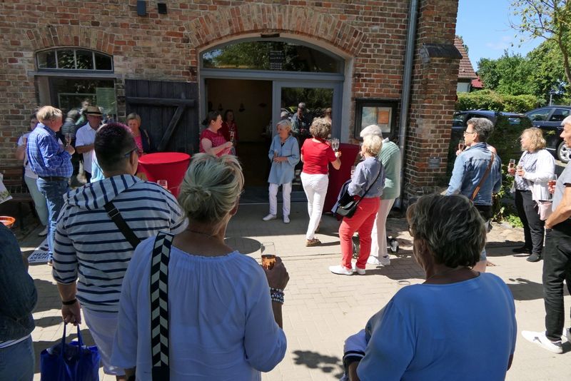 Während des SommerCafés wurde die Ausstellung "Norddeutsche Landschaft und Menschen" von Dr. Heidrun Kohlmann, einer Freizeitmalerin aus Warnemünde, eröffnet. Gearbeitet hat sie bis zum Ruhestand als Fachärztin für Neurologie und Psychiatrie. Mit gut 50 Bildern ist es eine große Ausstellung mit sehenswerten Motiven. Auf die Frage, welche der jeweilige Favorit sei, kam von Besucher*innen keine Antwort - so schwer ist die Auswahl. Alle Bilder können gekauft werden, eine Preisliste liegt aus, ebenso die Kontaktdaten der Künstlerin. Die Ausstellung ist bis Sonntag, 7.9.2025, in der Scheune zu sehen.