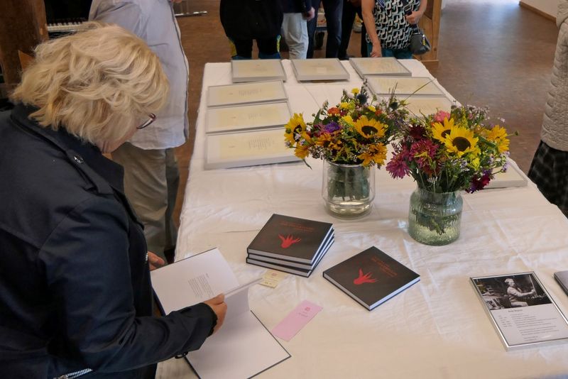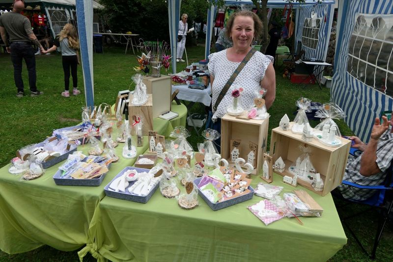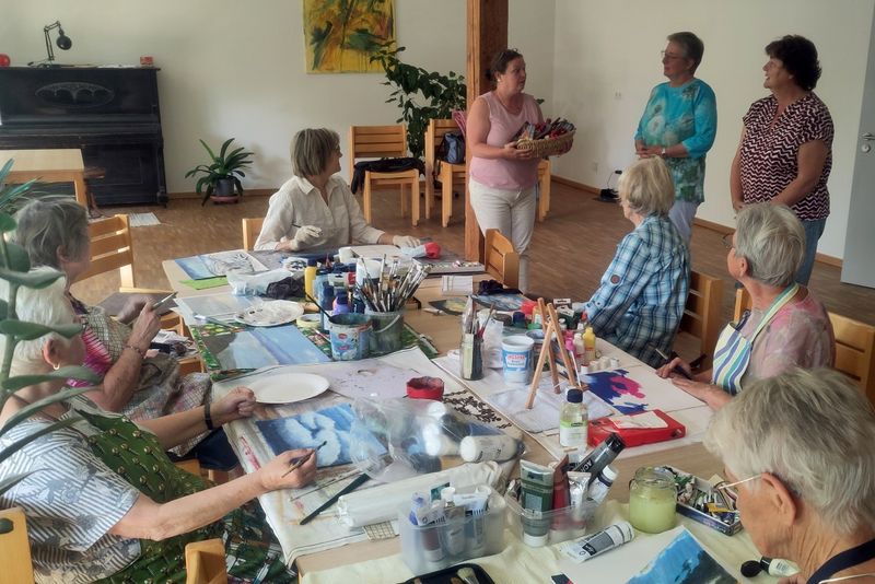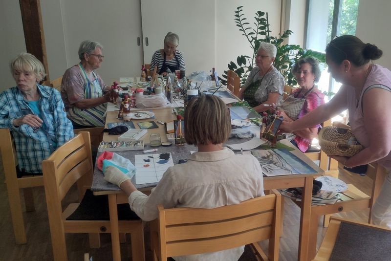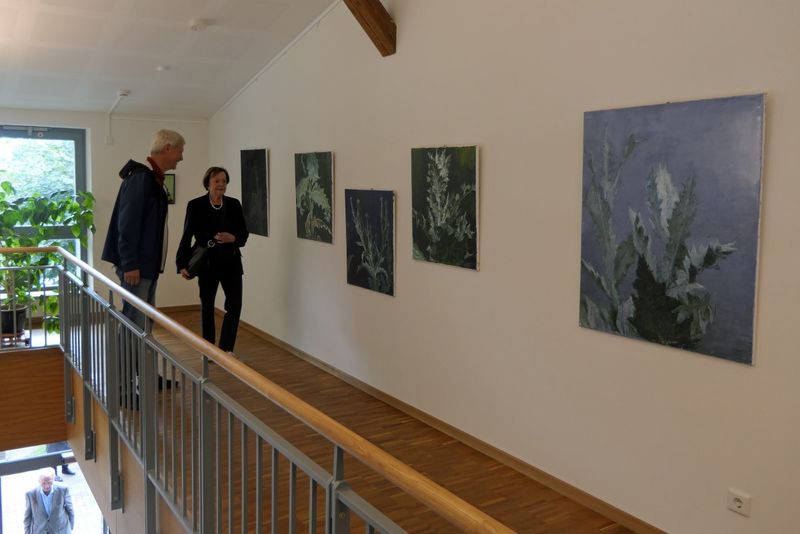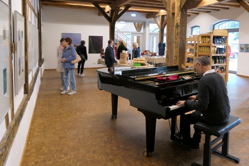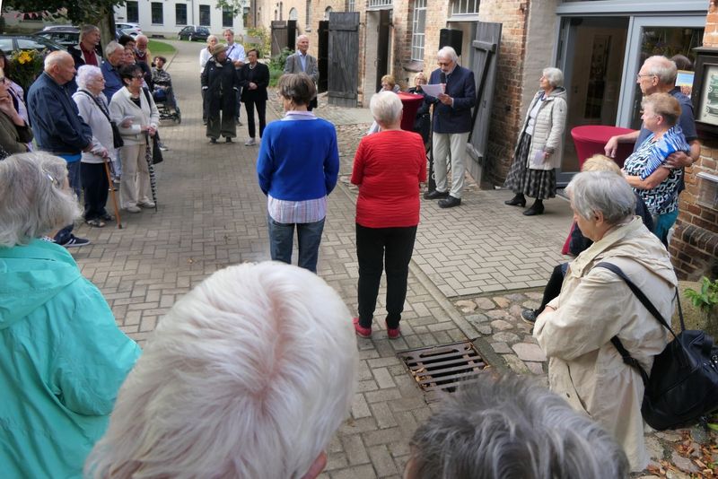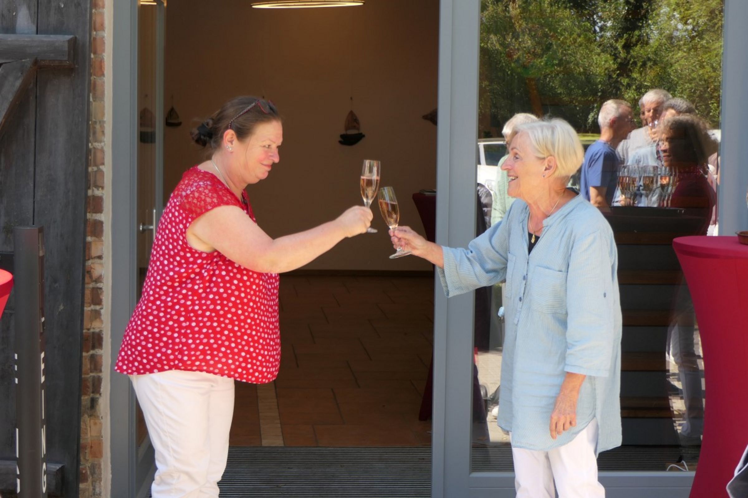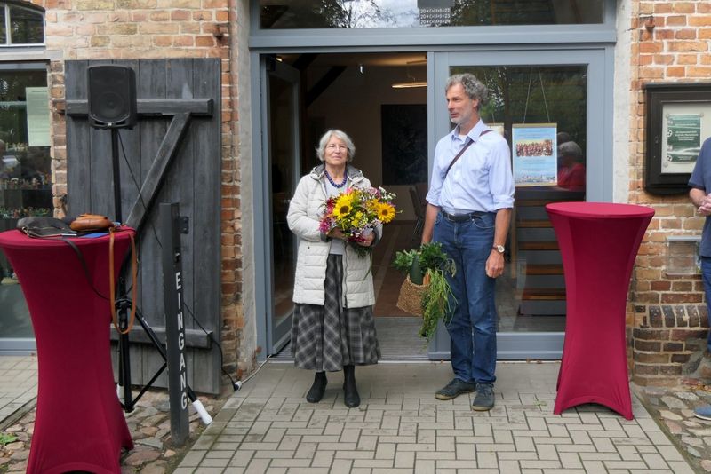 Während des SommerCafés wurde die Ausstellung "Norddeutsche Landschaft und Menschen" von Dr. Heidrun Kohlmann, einer Freizeitmalerin aus Warnemünde, eröffnet. Gearbeitet hat sie bis zum Ruhestand als Fachärztin für Neurologie und Psychiatrie. Mit gut 50 Bildern ist es eine große Ausstellung mit sehenswerten Motiven. Auf die Frage, welche der jeweilige Favorit sei, kam von Besucher*innen keine Antwort - so schwer ist die Auswahl. Alle Bilder können gekauft werden, eine Preisliste liegt aus, ebenso die Kontaktdaten der Künstlerin. Die Ausstellung ist bis Sonntag, 7.9.2025, in der Scheune zu sehen.