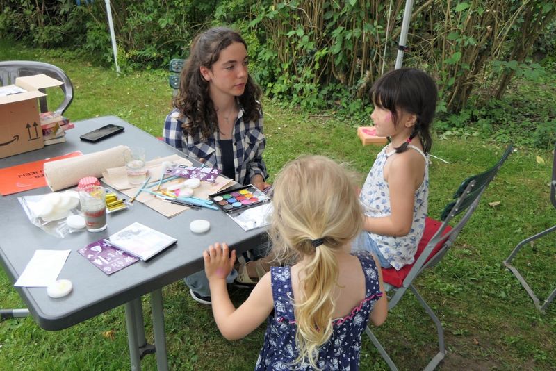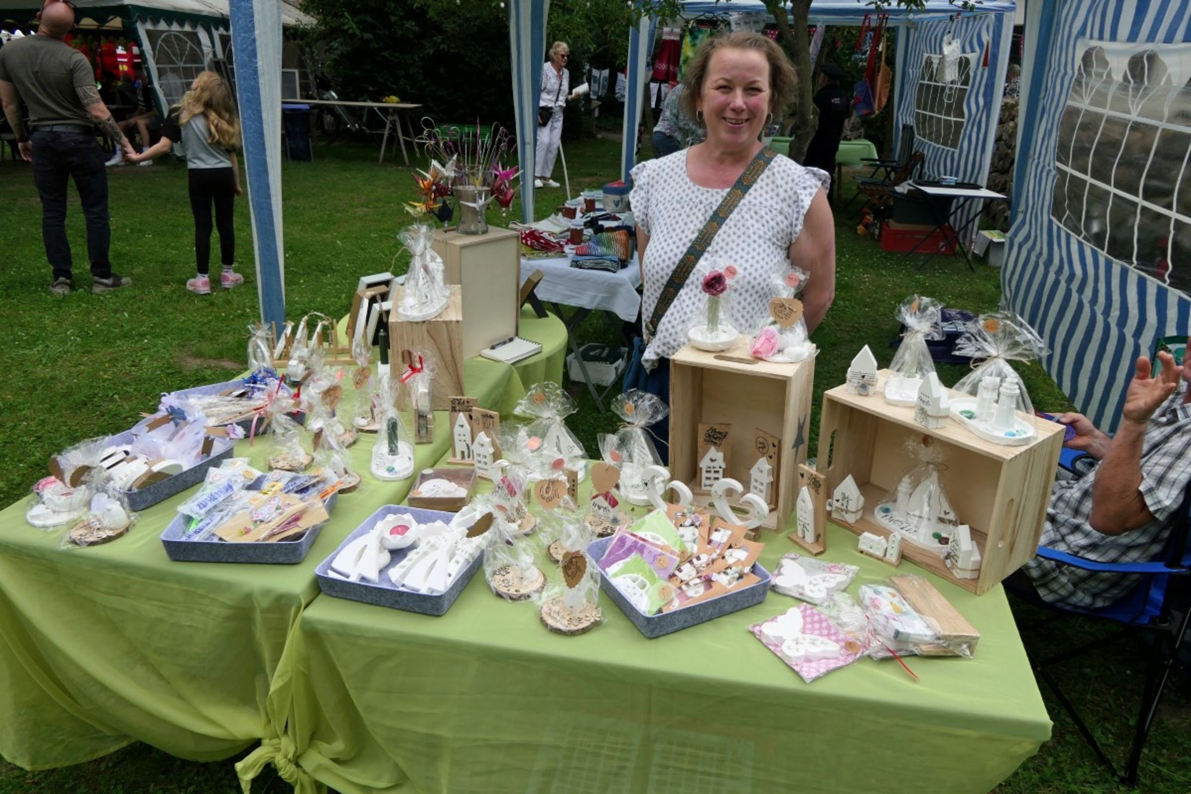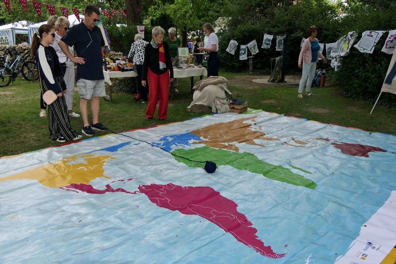 Mit einer Andacht unseres Weltladens zum Thema "Der Weg der Jeans" begann unser diesjähriges Sommerfest. Ein Band kreuz und quer durch die Kirche zeichnete den Weg vom Baumwollanbau über das Weben, Färben, Nähen bis in den Verkauf nach. Auf dem Weg zum Garten konnten zuerst die vielen Länder auf der großen Weltkarte gefunden werden, in denen die Jeans nach und nach hergestellt werden. Im großen Pfarrgarten waren etliche Stände aufgebaut, Kuchen gab es am Tresen, später herzhafte Salate. Grillwurst, Wildschwein, Getränke und ein Programm auf der Bühne trugen zur guten Stimmung bei. Hüpfburg für die Kinder, auf der Bühne Tanz mit den Kindern, später Tanz für die "Großen", zwei Sketche von Karina Both und Brigitte Kollmorgen sowie der Gesang von Anne-Sophie Kieseler erfreuten das Herz. Bis in den späten Abend hinein erklang die Musik.