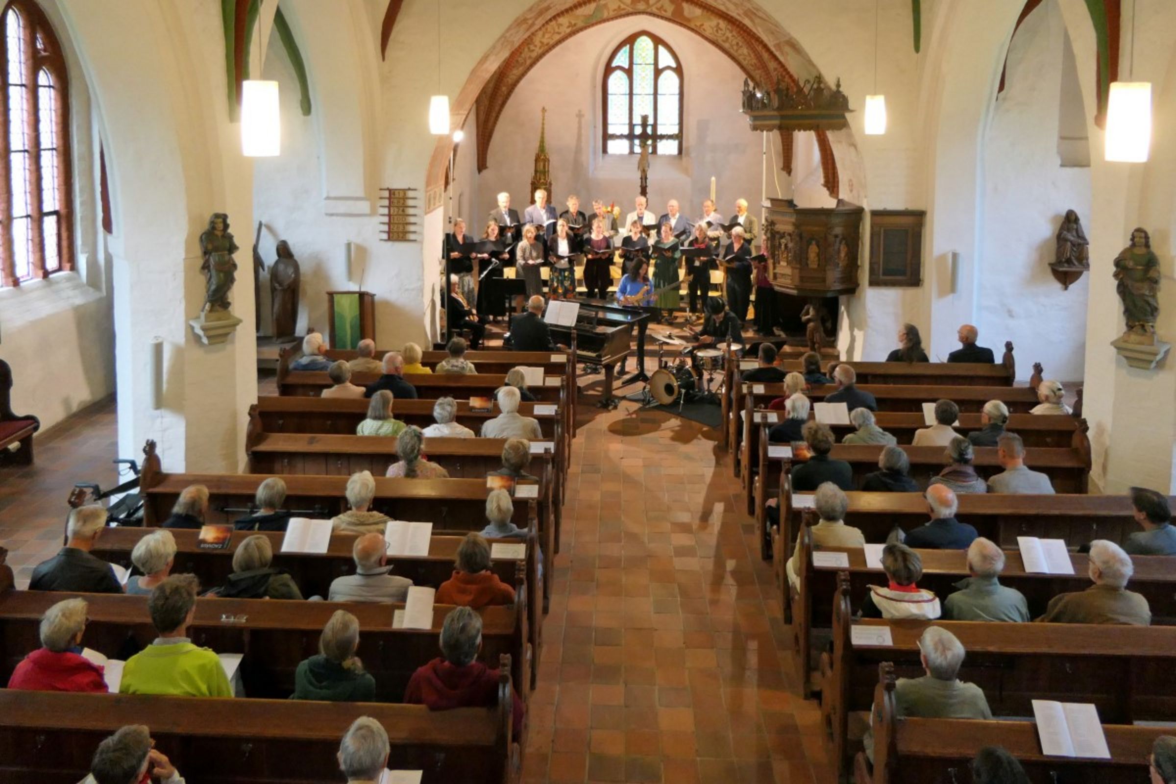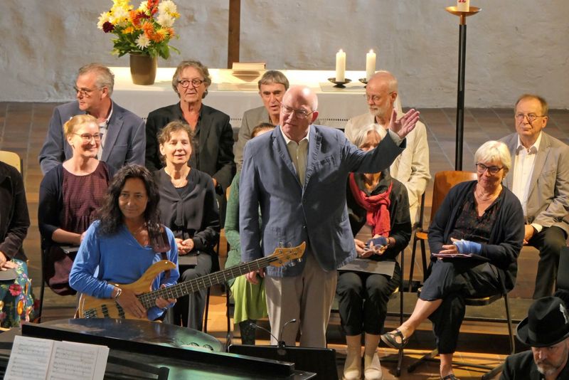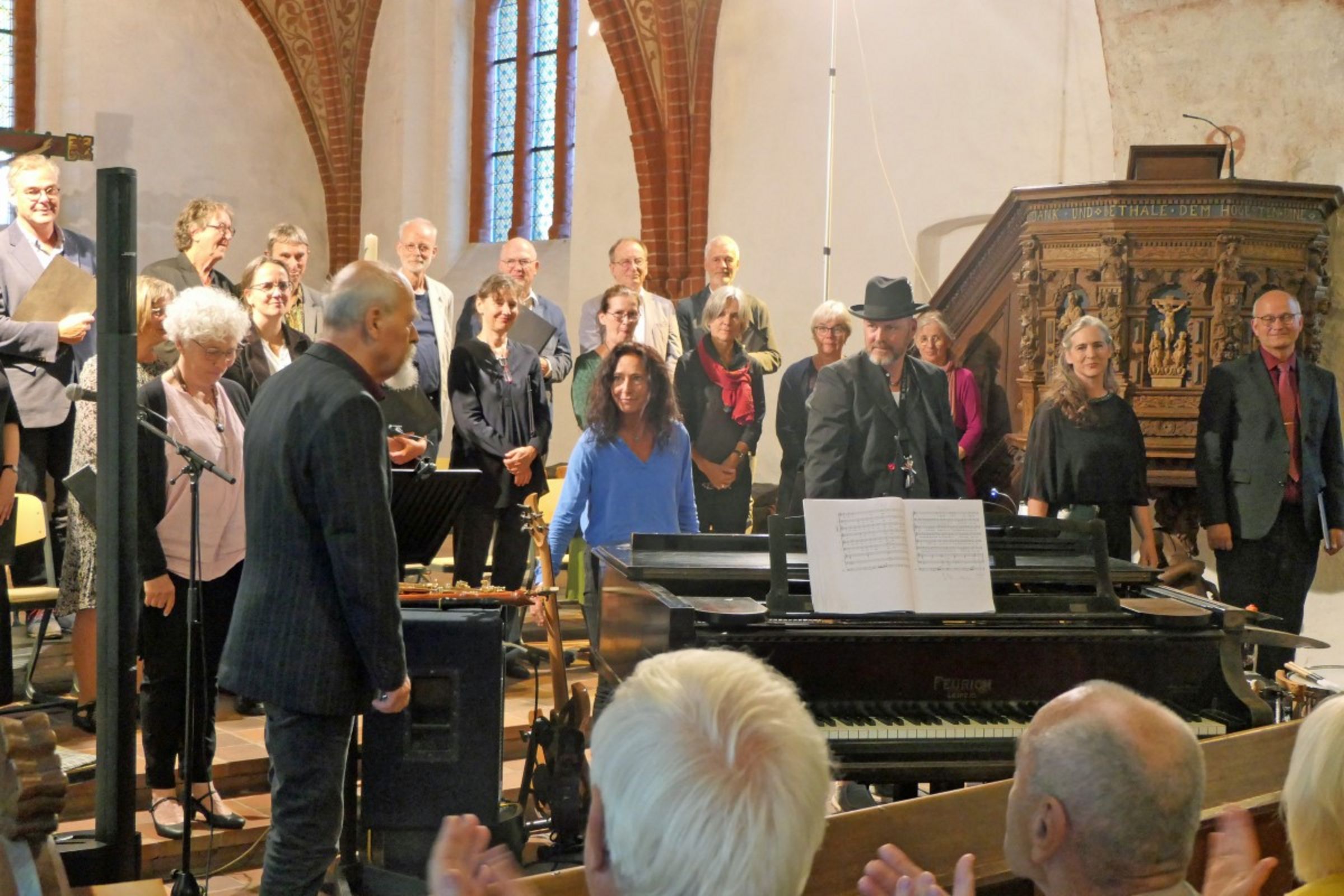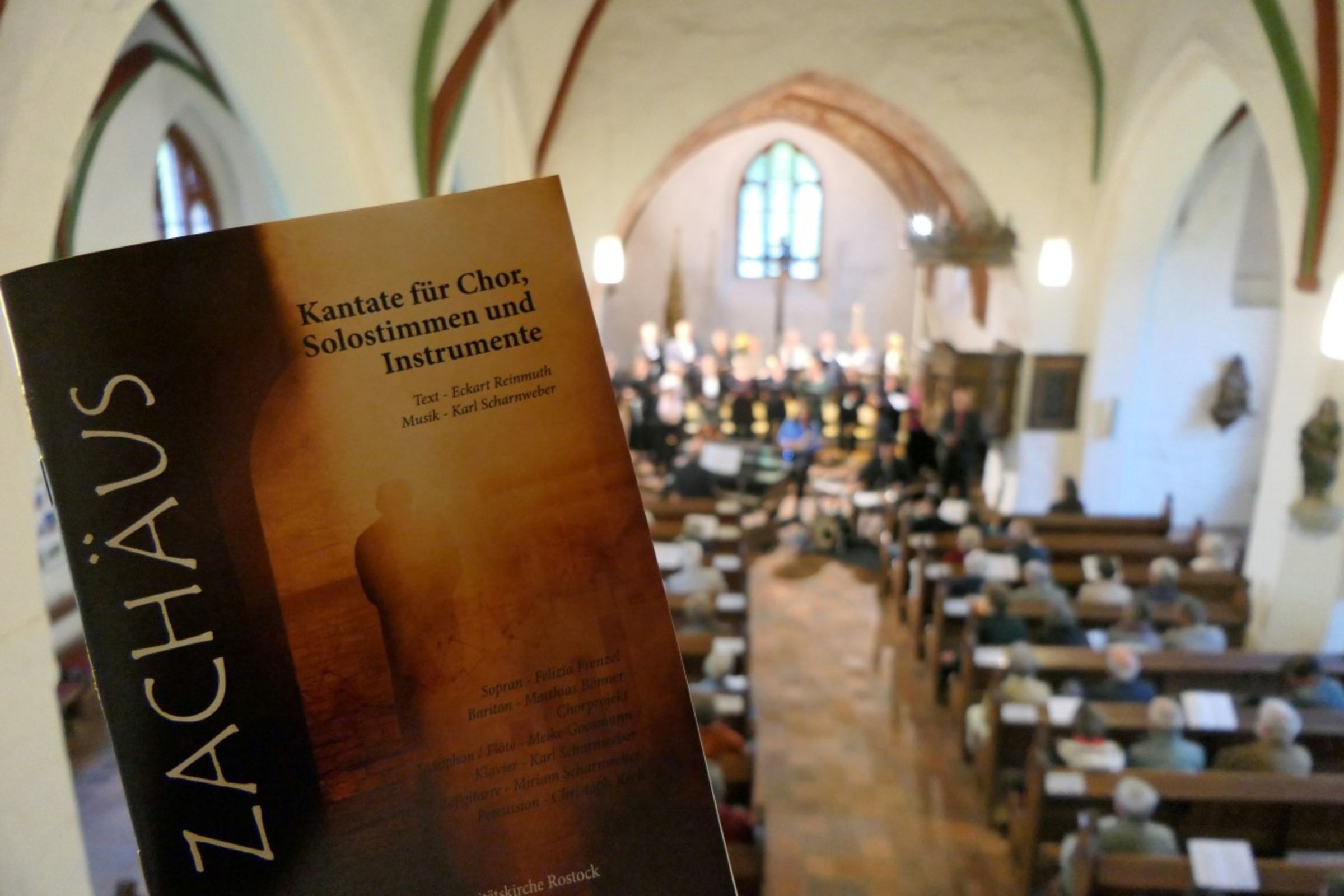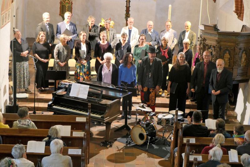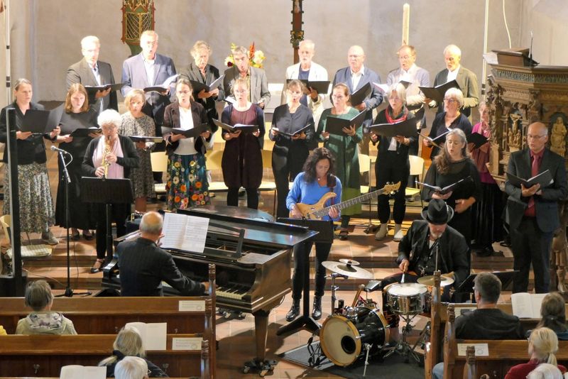 Die Zachäus-Kantate für Chor, Solostimmen und Instrumente erfreute über 70 Gäste in unserer Dorkirche. Eröffnet wurde das Konzert von Eckart Reinmuth, der den Text dafür schrieb und geleitet von Karl Scharnweber, Klavier, der die Musik komponierte. Mit den Solostimmen Felizia Frenzel, Sopran und Matthias Bönner, Bariton, dem Chorprojekt mit Sängerinnen und Sängern aus der Rostocker Region und zwei Musikerinnen, Miriam Scharnweber, Baßgitarre und Meike Goosmann, Saxophon und Flöte, und einem Musiker, Christoph Keck, Percussion, erklang eine atemberaubend schöne Musik zur biblischen Geschichte des Zöllners Zachäus (Lukasevangelium 19,1–10). Die Kantate erzählt von der Sehnsucht nach Veränderung und dem Mut zur Begegnung. Zachäus denkt durch die Begegnung mit Jesus um und wagt sich an neue Perspektiven für sein Leben (aus dem Programmheft).