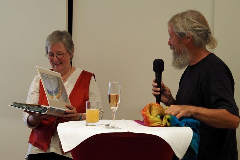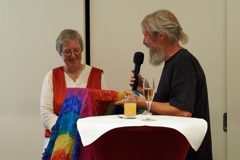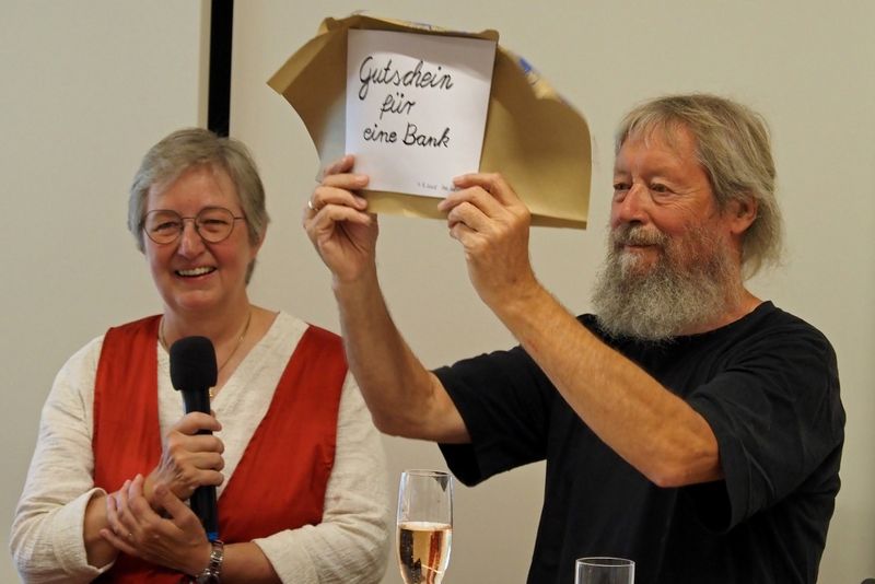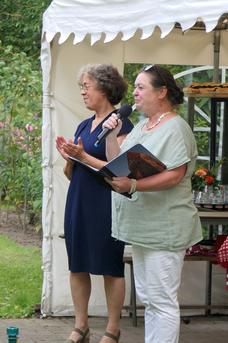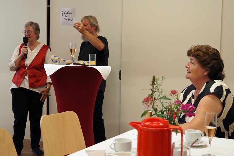 Im Saal der Scheune schloß sich ein großer festlicher Empfang an. Nach dem Sekt gab es Grußworte von Pastorin Anke Kieseler, Frau Albrecht von der Tagespflege im middenmang, die Übergabe von persönlichen Grüßen aus der Gemeinde, zusammengefasst in einem Ordner und zu guter Letzt ein Geschenk von Pastorin Möhr an die Gemeinde - eine Gartenbank, dem sich Pastorin Kieseler mit einer weiteren Bank anschloß. Sie werden vervollständigt mit einem Tisch unter dem großen Nußbaum an der Westseite der Scheune stehen.
