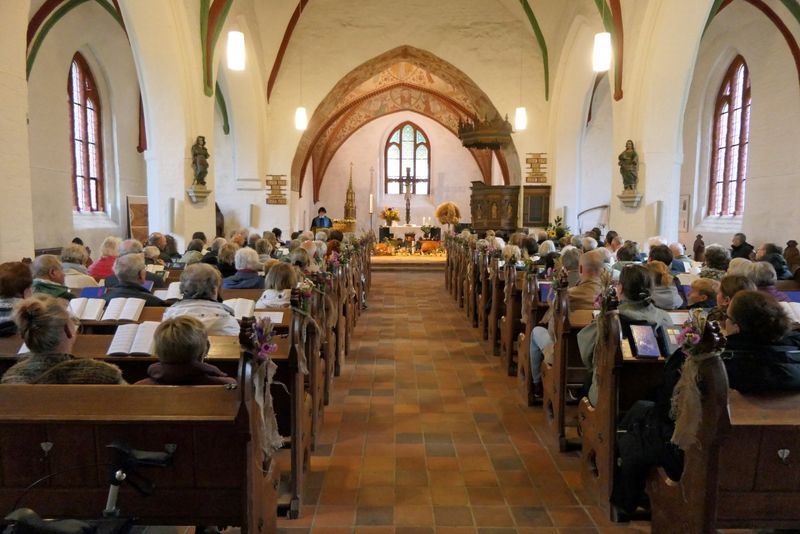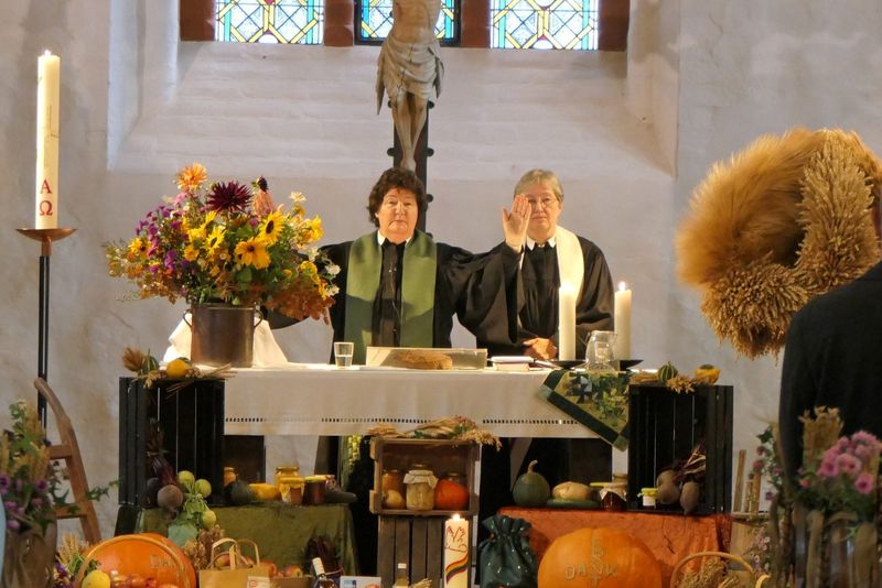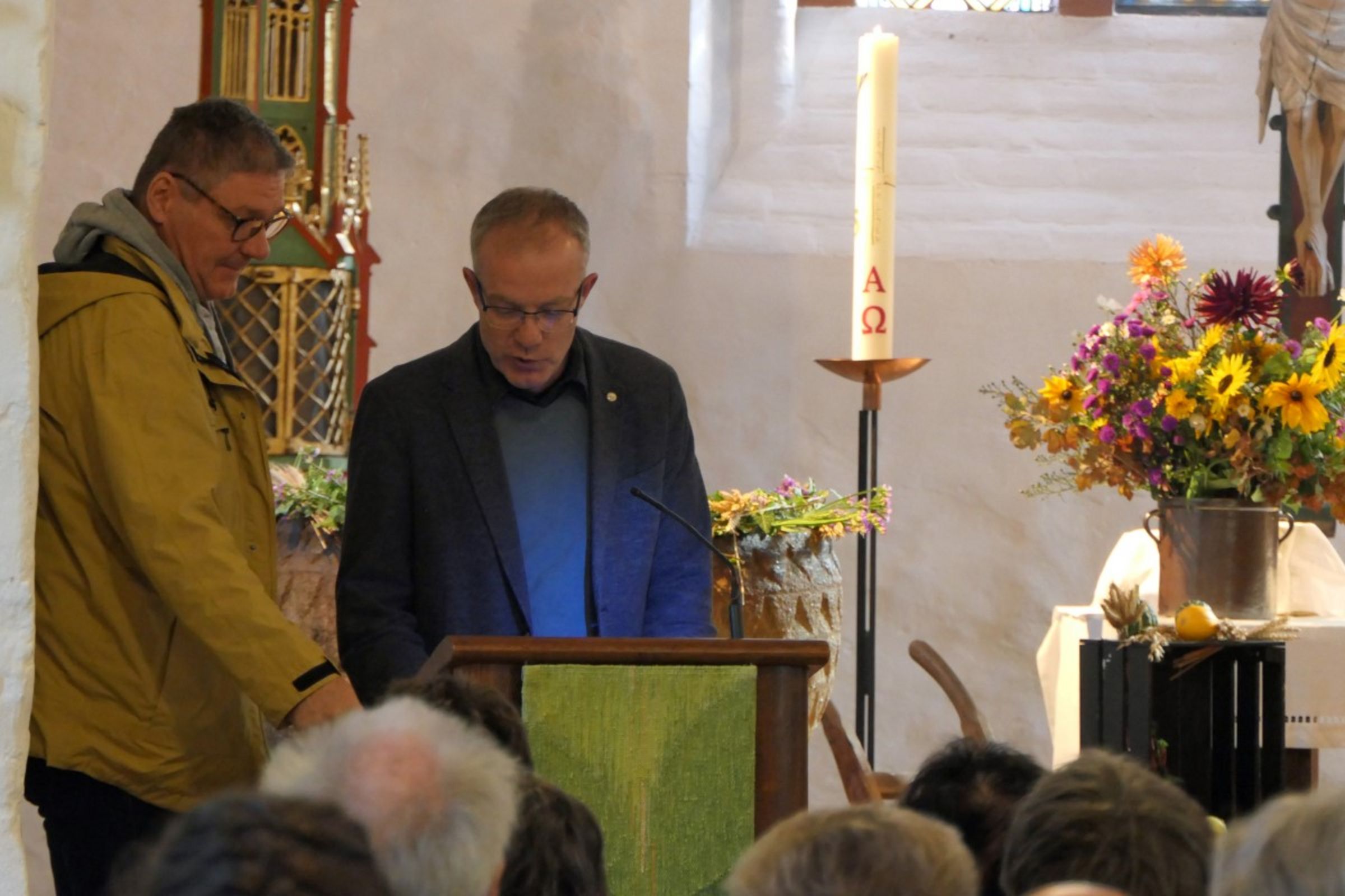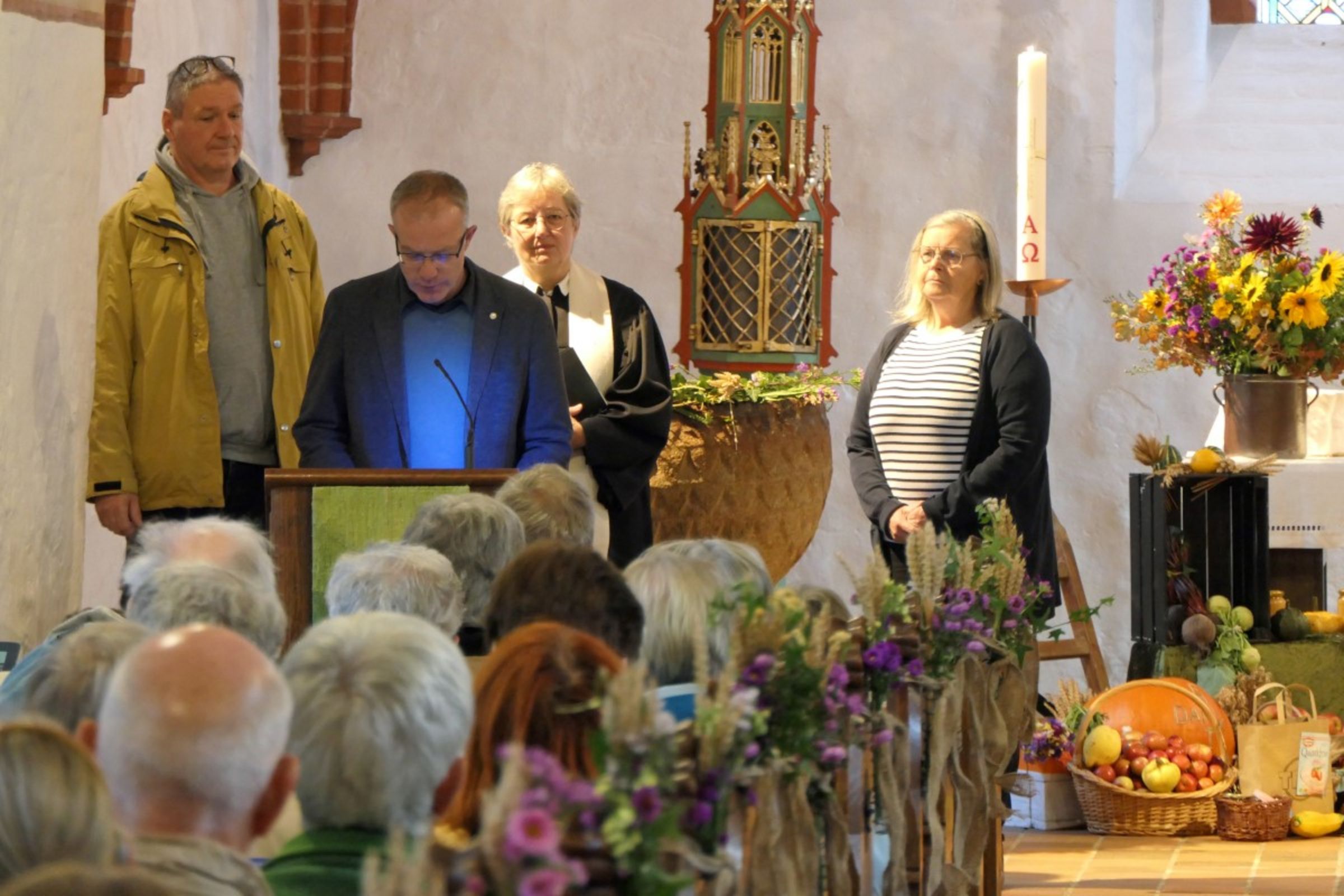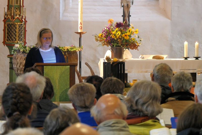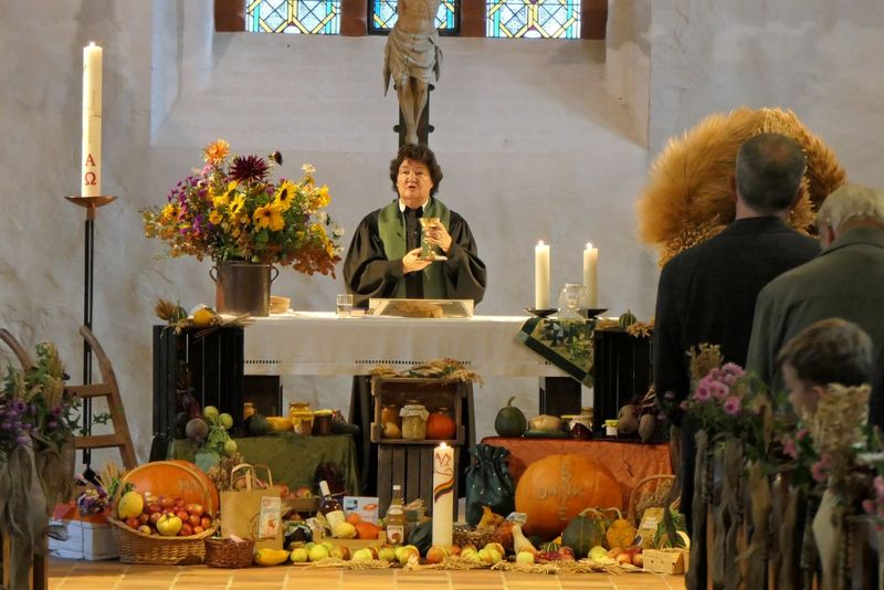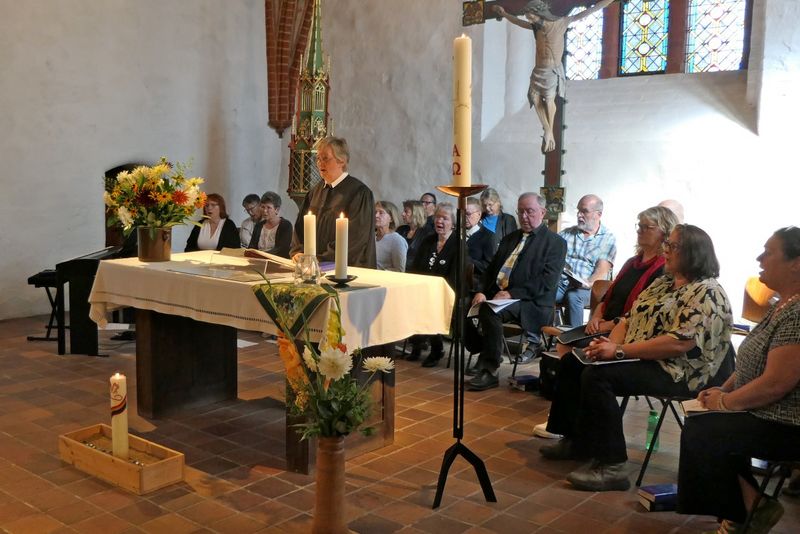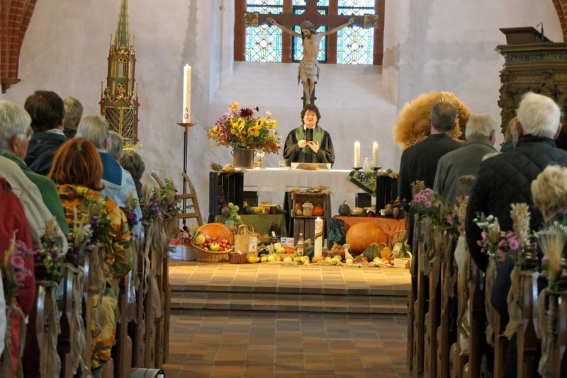 In der festlich geschmückten Dorfkirche feierten wir einen Abendmahlsgottesdienst zum Erntedankfest. Die Predigt hielten drei Kirchenälteste Brigitte Kollmorgen, Peter Erben und Steffen Jahncke mit sehr persönlichen Worten zum Thema "Mut", gemeinam mit Pastorin Uta Möhr. Die Liturgie und Abendmahl im großen Kreis in der Kirche wurden von Pastorin Anke Kieseler geleitet. Anschließend wurden Grüße aus dem Gottesdienst in etliche Häuser zu Menschen gebracht, die nicht am Gottesdienst teilnehmen konnten.