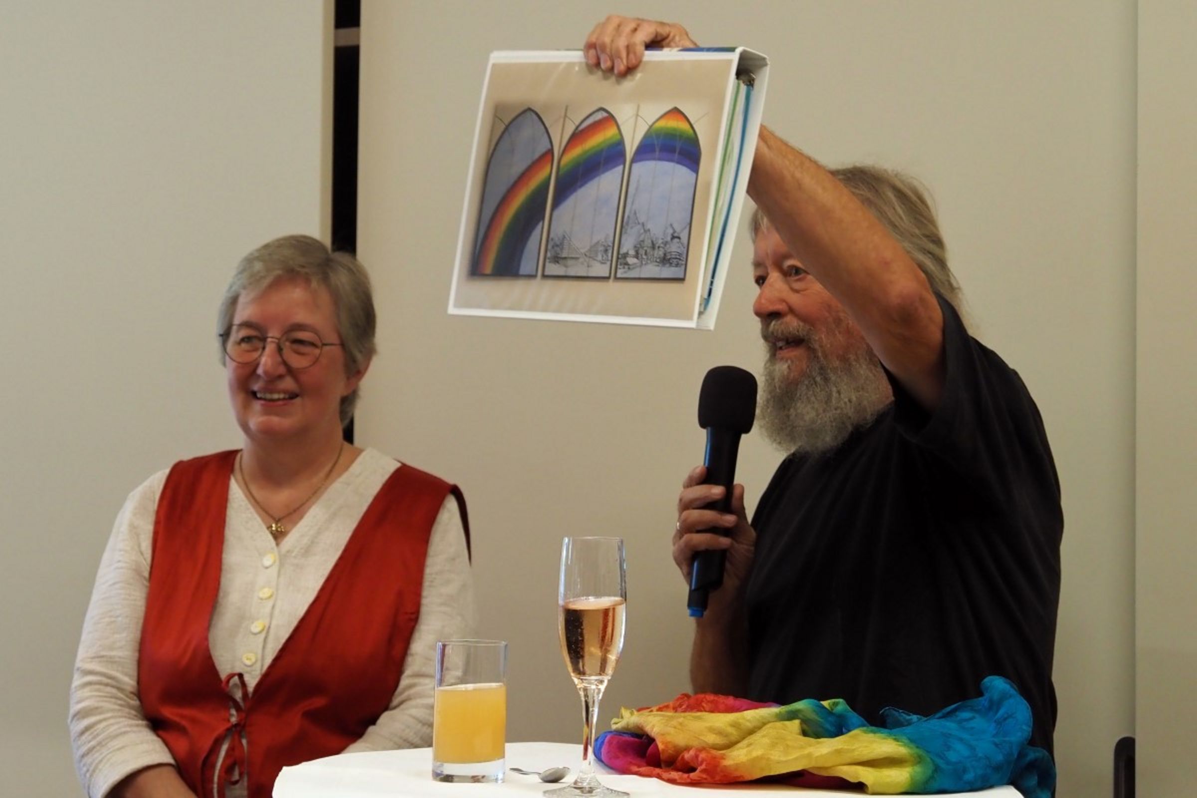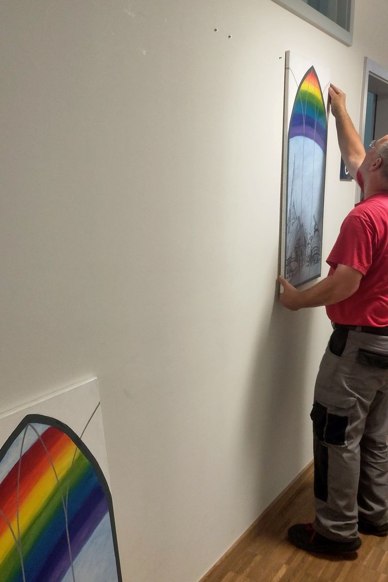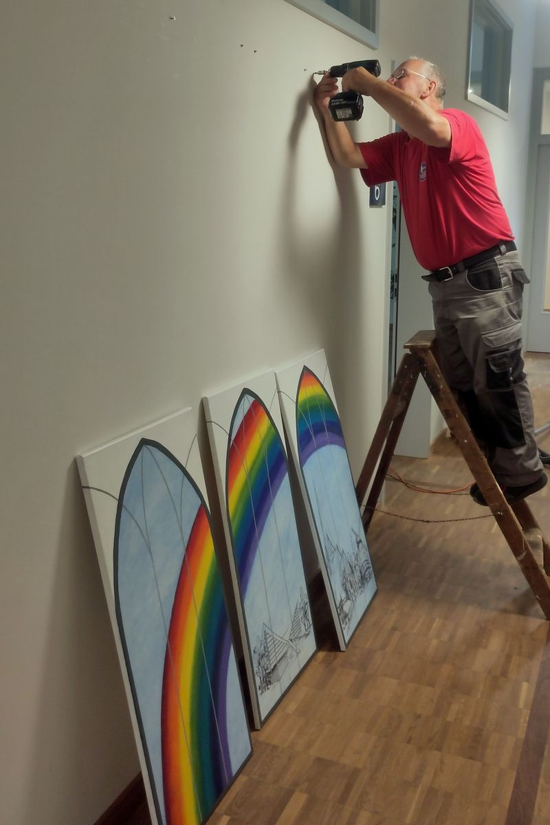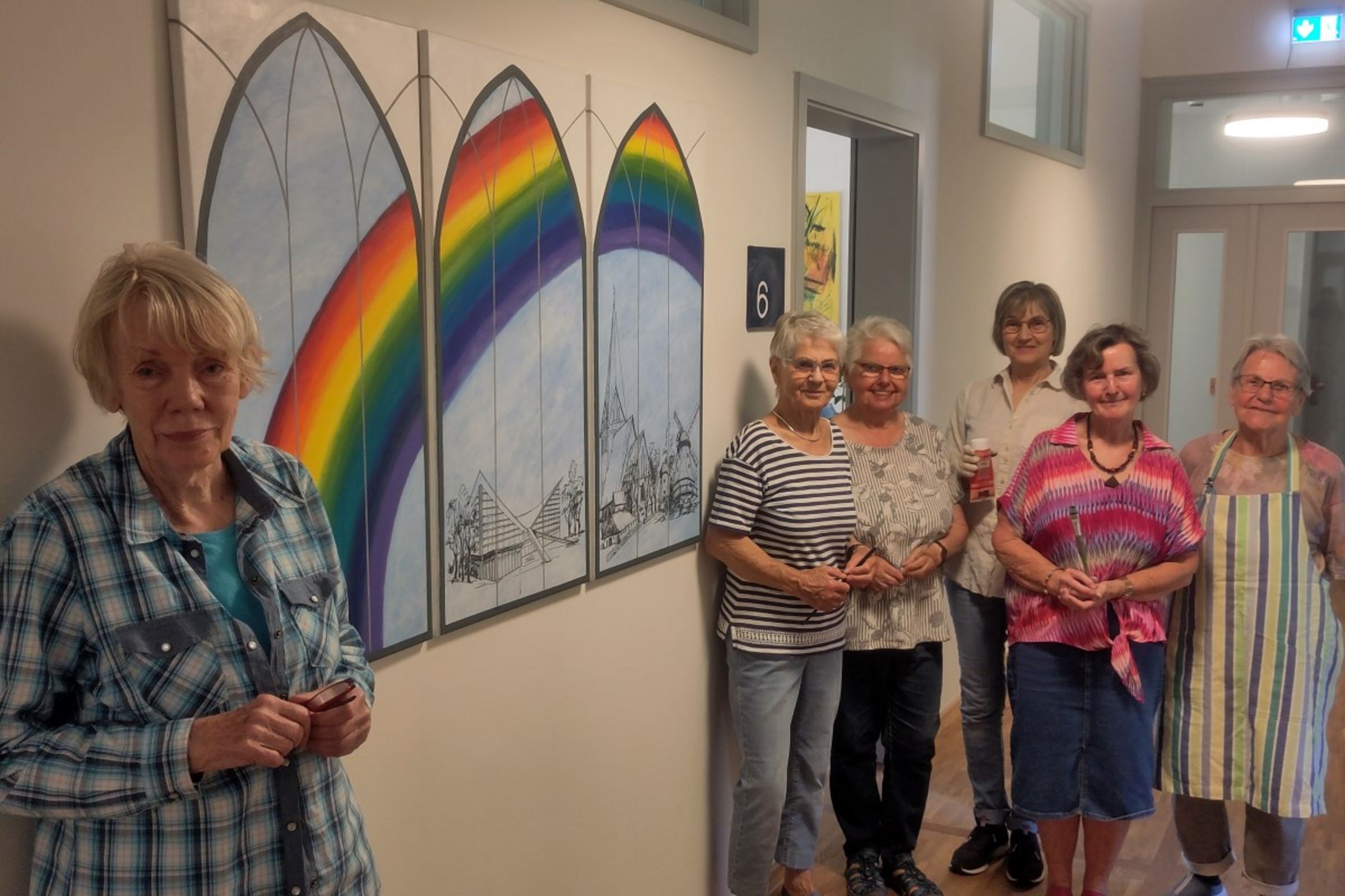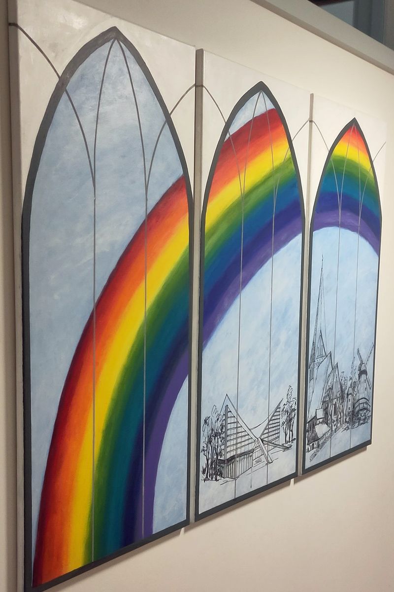 Der "Farbkreis 10" unter Leitung von Barbara Relitz hat für den Flur im OG der Scheune ein wunderbares Bild - nein, drei Bilder - gemalt. Ein Regenbogen in drei symbolischen Kirchenfenstern, dazu Federzeichnungen von Orten unserer Gemeinde - die typische Mehrzweckhalle in Lütten Klein und die Lichtenhäger Kirche samt Windmühle. Schauen Sie beim nächsten Treffen in der Scheune das Original an, einfach schön.