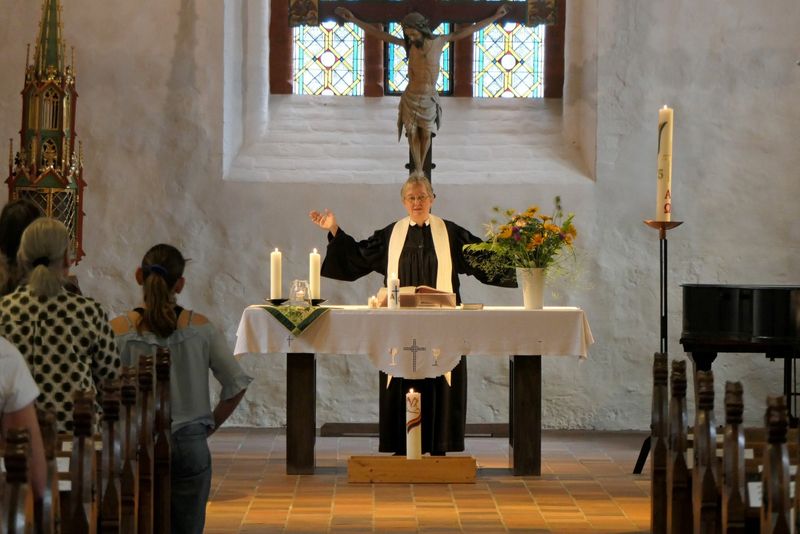 Pastorin Anke Kieseler: Und so wurde unsere Dorfkirche in den kommenden Jahren saniert, mit einer Fußbodenheizung versehen und Heimat für zunächst zwei evangelische und eine katholische Kirchengemeinde. Etwas später kam noch die Kirchengemeinde Lichtenhagen Stadt (jetzt: Ev.-Luth. Kirchengemeinde Rostock St. Thomas) hinzu.