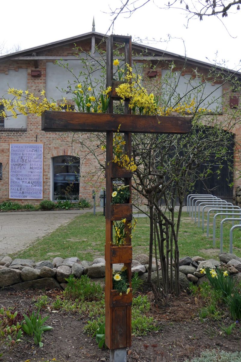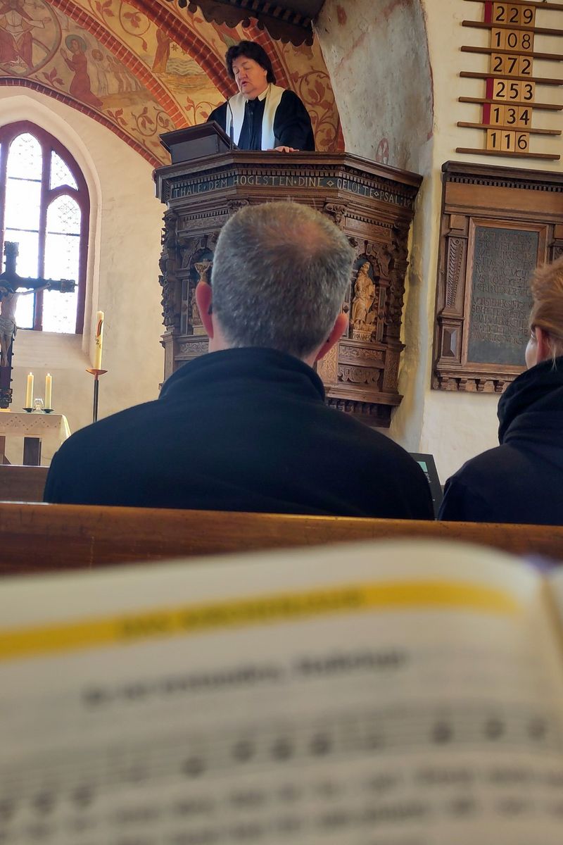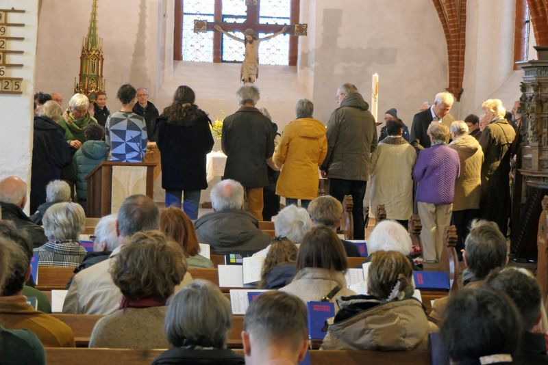 Am Sonntag vor Ostern - Palmarum - feierten wir in der Dorfkirche eine berührende Passionsandacht. Virginia Abs sang zum Gong einen Psalm, Lieder von Hildegard von Bingen mit dem Monochord und eine Vokalimprovisation mit Klangstäben. In zwei Lieder stimmte die Gemeinde ein, Kantor Andreas Hain spielte Orgel und ließ seine Stimme mit einem französichen Magnificat erklingen. Eine Schola mit Siegfried Keil, Knut Heller, Christian von Dorrien, Friedrich Heilmann und Andreas Hain bot drei gregorianische Gesänge dar, die in der Kirche in besonderer Weise widerhallten.