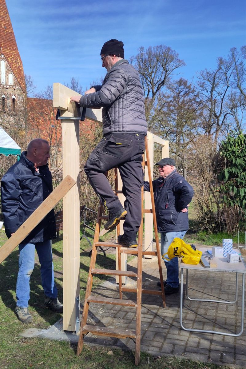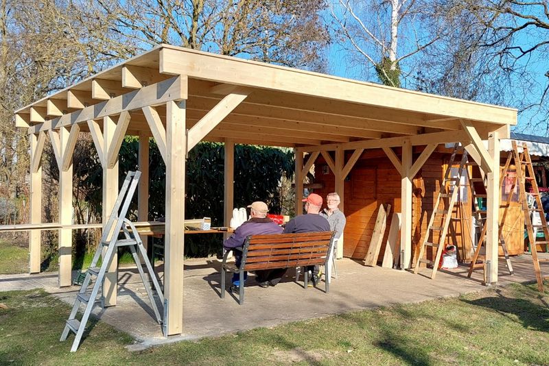 Von einem Hersteller aus Bützow wurde Anfang März ein entsprechender Carport-Bausatz geliefert. Vorbereitend erfolgte die Herstellung der Fundamente für die Pfostenträger. Der eigentliche Aufbau begann eine Woche später und konnte nach vier Tagen abgeschlossen werden.
