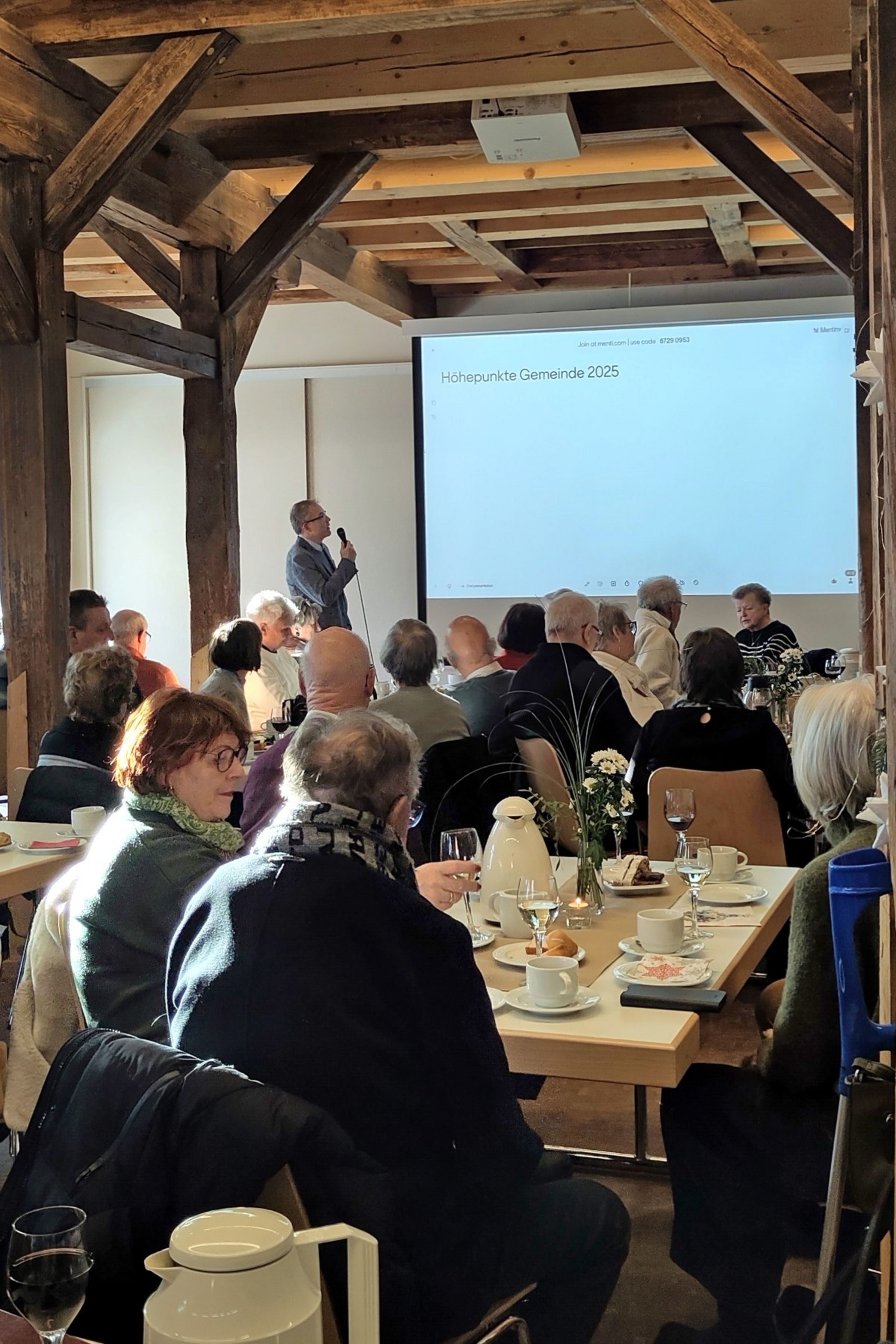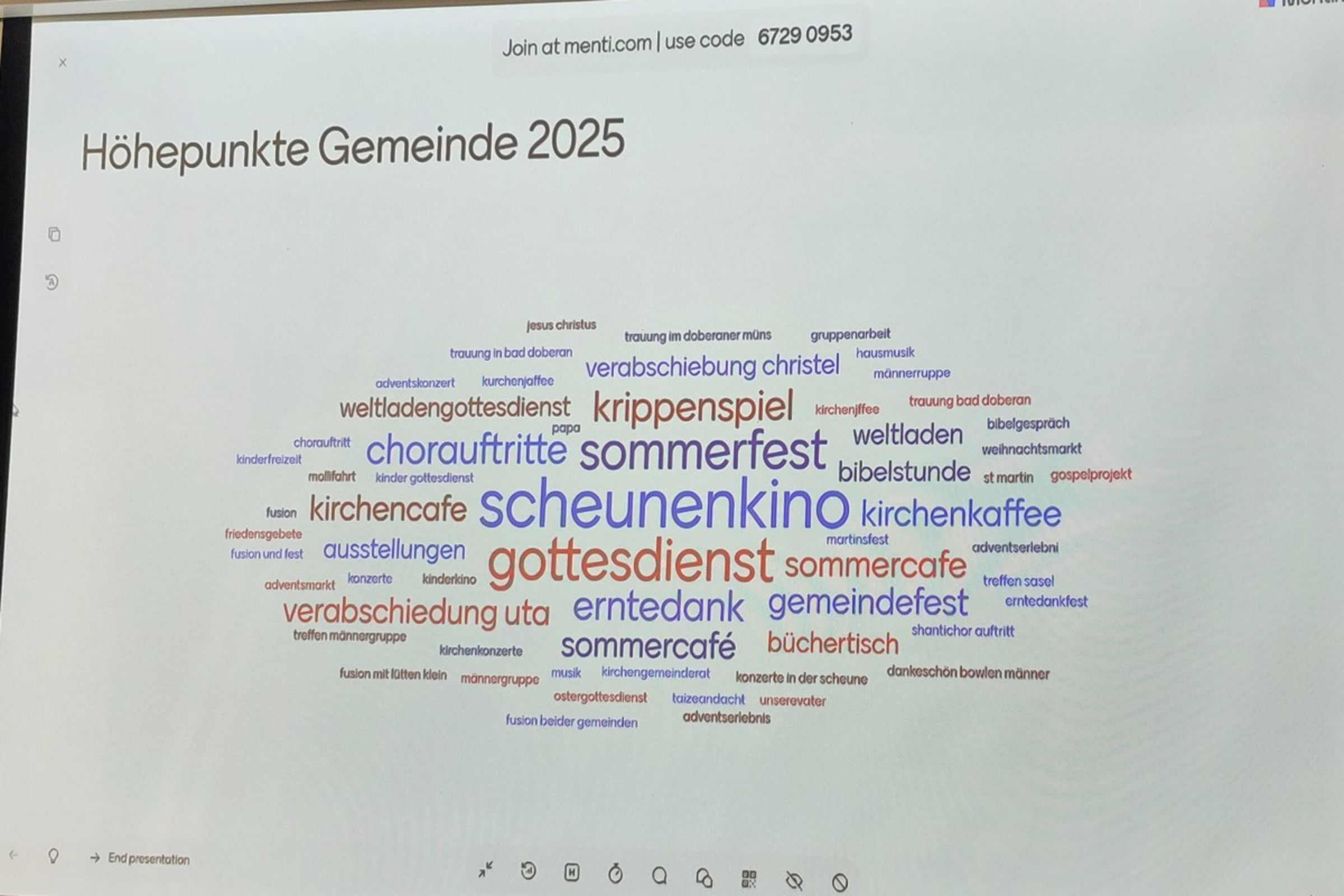 Die volle Kirche zum Gottedienst versprach auch rege Beteiligung am Neujahrsempfang. Und viele, viele kamen. Anstoßen mit Wasser, Weiß- und Rotwein auf das neue Jahr. Alle wurden eingeladen, sich an einer "Wortwolke" zu den Höhepunkten des letzten Jahres zu beteiligen. Mit Nachbarschaftshilfe an den Tischen gelang es gut. Die große Fotorückschau lief automatisch durch und es war aufmerksame Stille im Saal - so viele gute und große Dinge sind noch einmal zu sehen gewesen. Herzlichen Dank an alle Vorbereitung und Durchführung des Empfangs, es war wieder zum Genießen in großer Gemeinschaft.