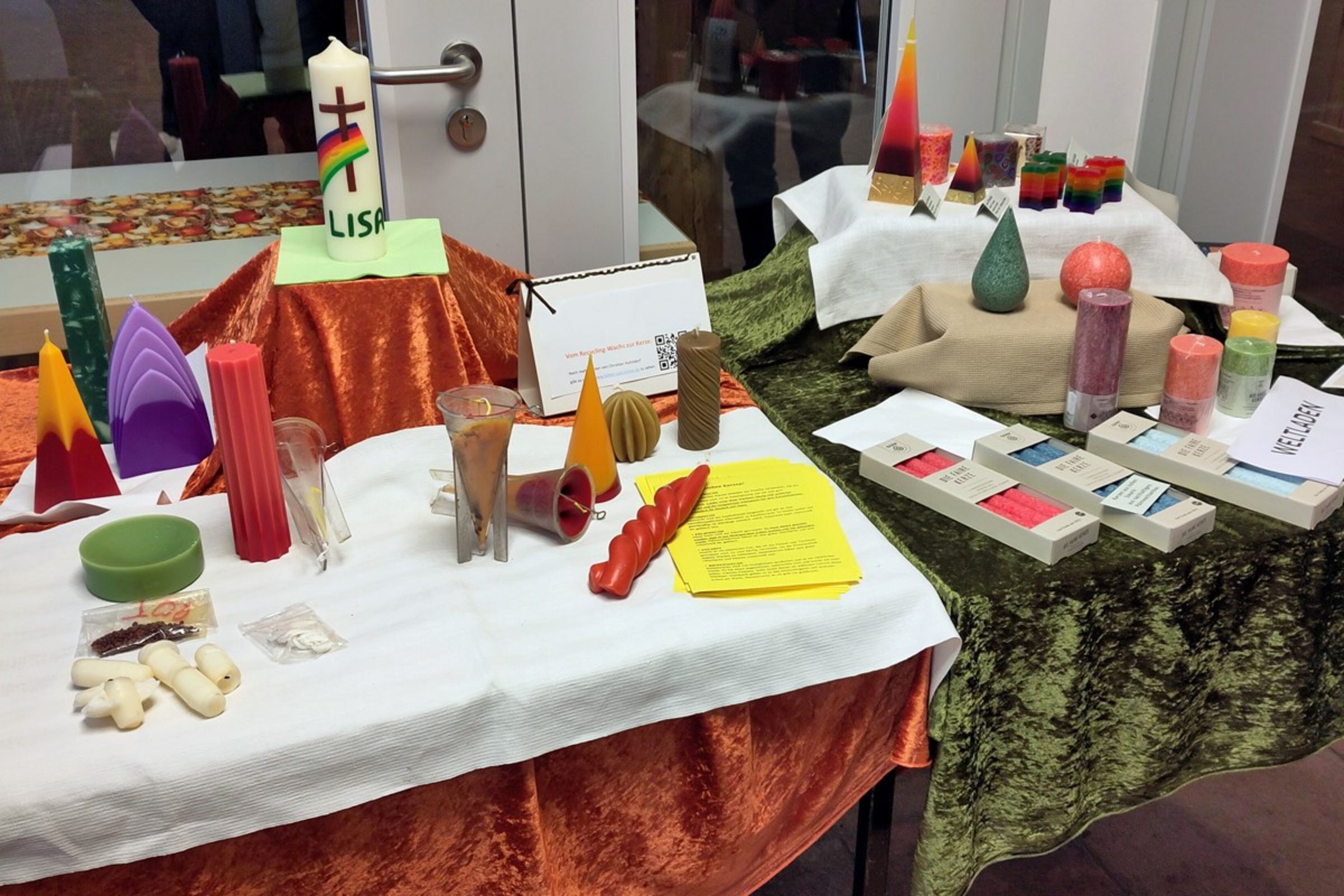 Mit Weltladen und Nähcafe repräsentierten wir am 28.11.2026 auf dem neu gestalten Adventsnachmittag im Gemeindezentrum Elmenhorst - Lichtenhagen auch die Friedenskirchengemeinde. Etwas kleiner stellten sich Weltladen, Nähcafe sowie Friedenskirchengemeinde im Mehrgenerationenhaus auf den jährlichen Adventsmarkt am 29.11.2025 vor. In der Waldorfschule brachten die Konfirmandinnen (Henni und Luisa) mit einem Schokoladenpuzzle, die Ungerechtigkeiten beim Kakaoanbau und der Skandal der immer noch währenden Kinderarbeit deutlich als Information für ca. 55 Kinder und ihren Familien an. - 14.12.2025: Die Kerzenausstellung in der Scheune zeigt vom Weltladen die verschieden fairen Kerzenkooperativen Zwazi-light Südafrika, Asha - Hoffnung Indien Mumbai und Wax Industri Indonesien mit nachhaltige Palmwachskerzen.