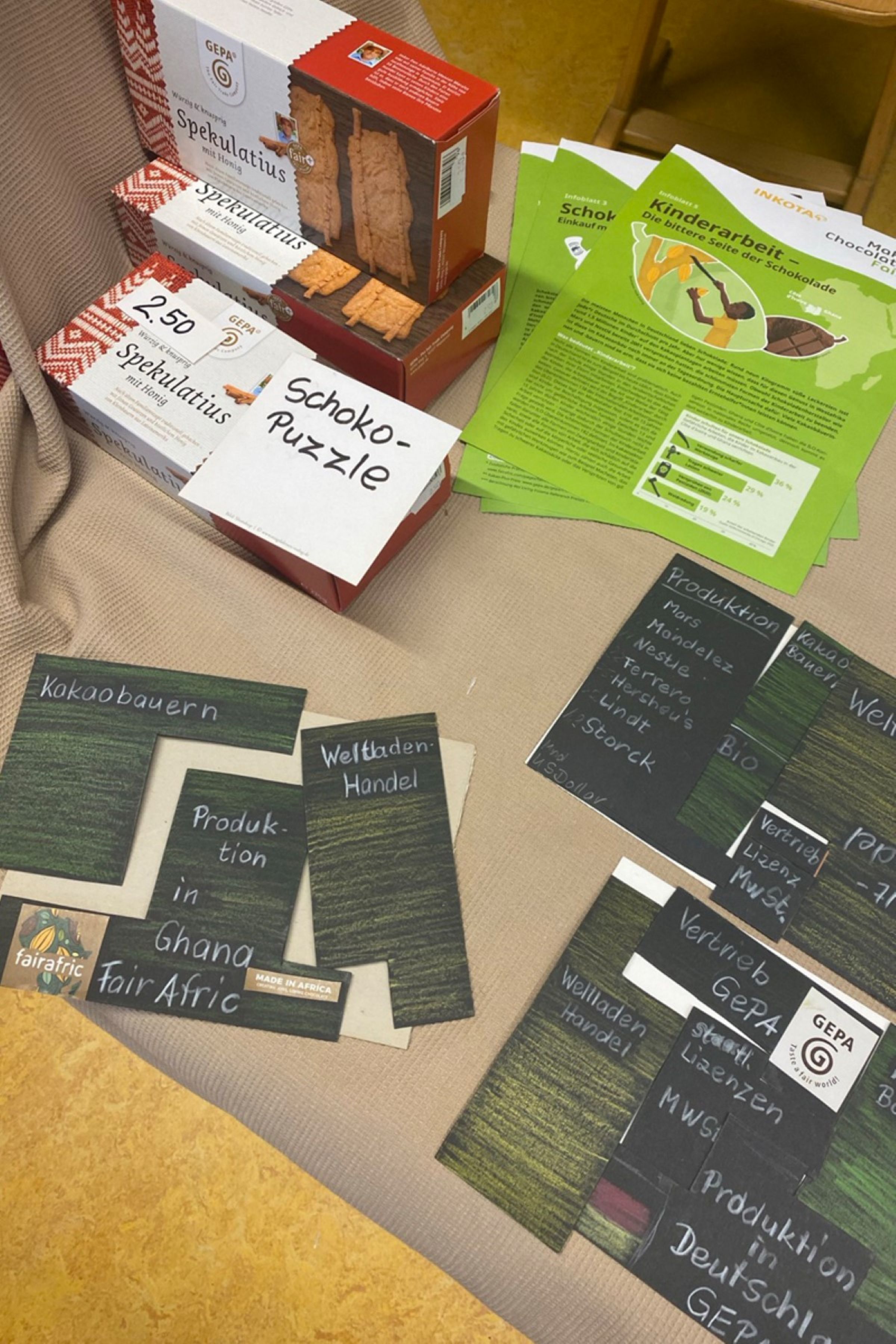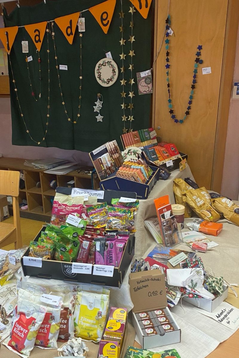 - 30. November: Zum ersten Mal wurde in allen vier Cafes des Adventsmarktes der Waldorfschule Rostock fair gehandelter Kaffee ausgeschenkt, den wir auch am Stand verkauften. Gleichzeitig luden wir Kinder und Erwachsene ein, mit drei verschiedenen Schokoladenpuzzles die Unterschiede in der Bezahlung der Kakaobäuer*innen zu sehen: