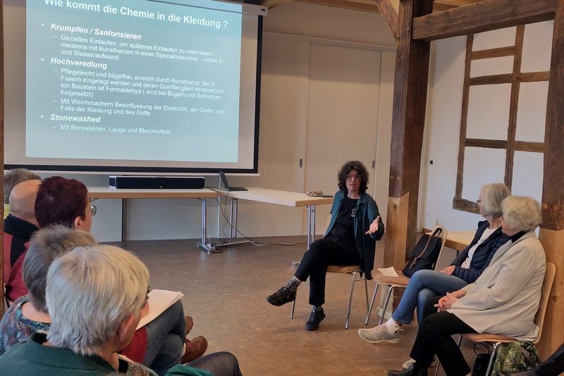 - 3.4.2025: Im Nachgang zur Bildungsreise zog sich das Thema „faire Kleidung“ durch das gesamte Jahr 2025 mit zahlreichen Veranstaltungen und Bildungsangeboten. Frau Claudia Greifenhahn aus Dresden hielt 2 Vorträge in der Pfarrscheune. Am 3. April war der Vortrag zugeschnitten auf Weltladenmitglieder, die so zahlreiche Details zur Herstellung, Stoffbehandlung und Transporten erfuhren. Eine interessante und sehr lange Diskussion schloss sich an den 45-Minütigen Vortrag an.