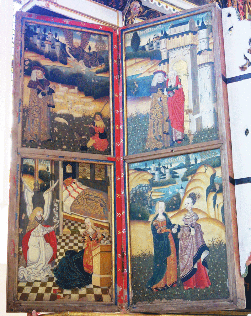 Die Innenseite zeigt die Annenlegende und Darstellungen aus dem Marienleben. Oben links ist die Verkündigung des Engels an Joachim zu sehen. Joachim kehrt nach Jerusalem zurück und umarmt seine Frau Anna. Das darauffolgende Bild zeigt Anna im Wochenbett, das letzte, wie Maria die Stufen zum Tempel hinaufschreitet. Sie wird von einem Priester empfangen, während ihre Eltern Joachim und Anna am Aufgang stehen bleiben.