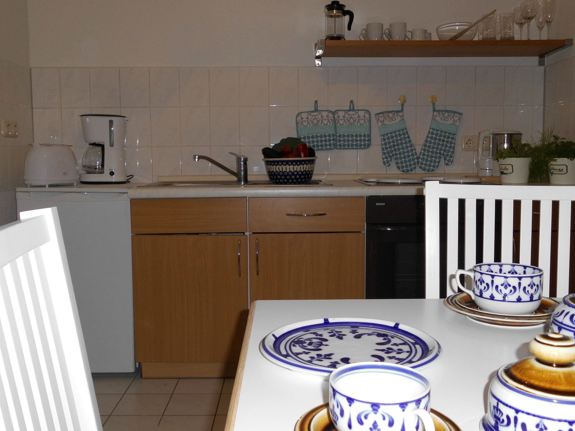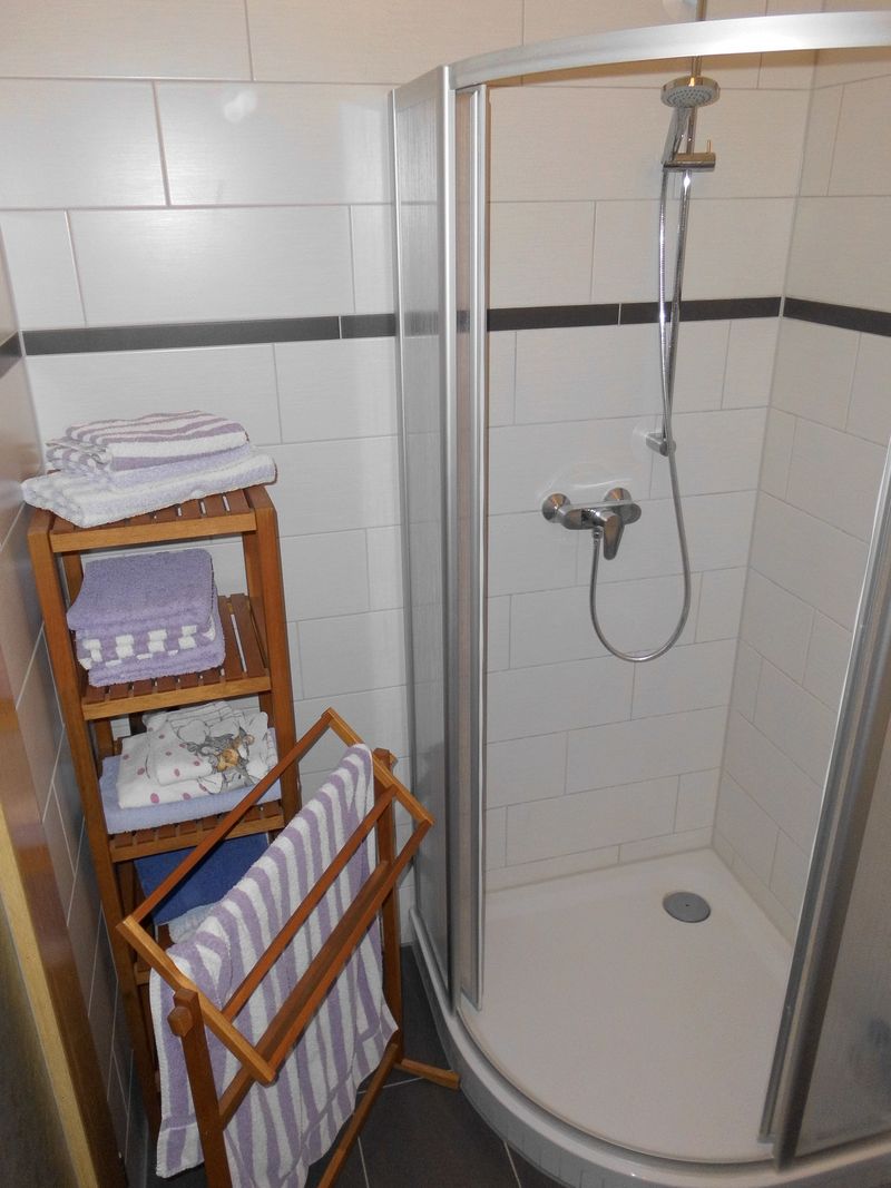 Unsere Ferienwohnung bietet auf ca. 40 qm reichlich Platz für zwei Personen. Eine zusätzliche Matratze oder ein Kinderbett können problemlos als Schlafplätze erweitert werden. Das helle kombinierte Wohn- und Schlafzimmer ist mit einem bequemen Sofa und einem Doppelbett ausgestattet. Der antike Kleiderschrank sorgt für ein gemütliches Ambiente im Zimmer. Ein Bücher- und Spieleschrank ergänzt die Ausstattung. Eine gut ausgestattete separate Küche mit einem Essplatz steht für die Selbstversorgung zur Verfügung. Das Bad mit Dusche und WC kompletiert das Feriendomizil.